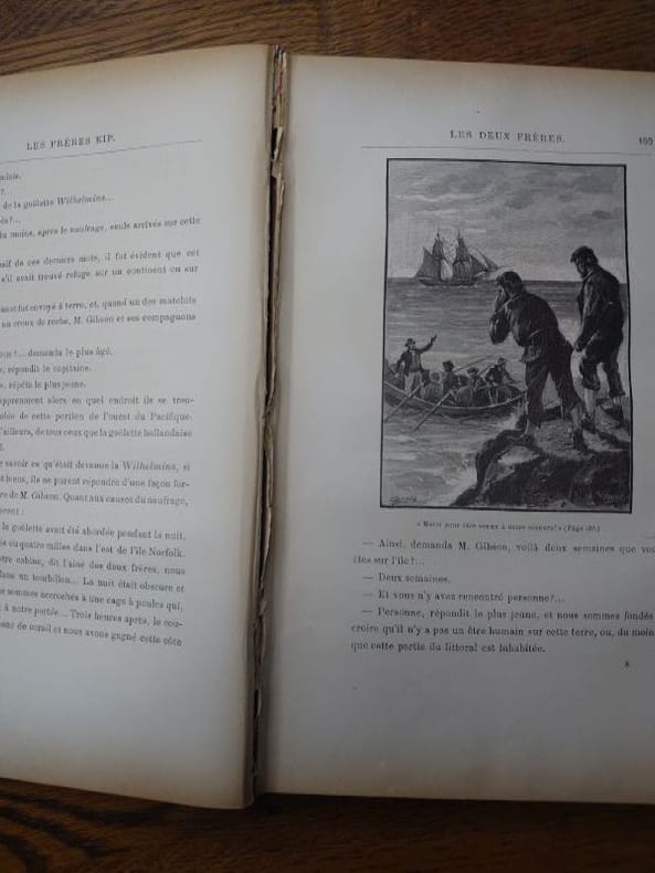 Première édition in-8 illustrée de 2 cartes, 12 grandes chromotypographies, 6 reproductions photographiques pleine page, (39 illustrations gravures et documents dont des photographies), par Georges Roux. Cartonnage d'éditeur Hetzel au globe doré, plaque signée Blancheland, reliée par Engel, dos au phare, second plat de type Engel "h" selon Jauzac. Belle première plaque aux ors bien marqués et brillants. Légères salissures dans le cartouche. Petits grattements dans le ciel. Quelques frottements sur la bordure rouge externe. 2 coins un peu émoussés, les coins repliés. Dos éclairci, mais aux ors bien présents. Frottements aux coiffes. Second plat bien, avec des salissures. Exemplaire un peiu gauchi. Rousseurs éparses. Bon exemplaire. Ce roman d'aventures se déroule en Nouvelle Zélande et en Nouvelle Irlande, sur un bateau qui récupère deux naufragés : les frères Kip, hollandais. Le navire fait route vers la Papouasie. - Photographies et détails sur www.Edition-Originale.com -