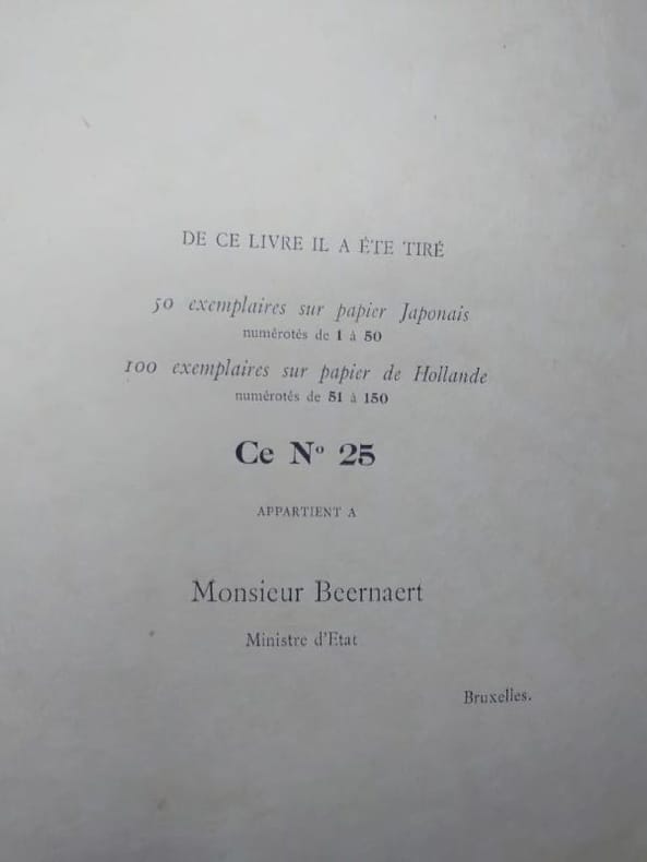 Paris, Librairie Perrin, Namur Jacques Godenne, 1900. 27,5 x 23,5 cm, 382 pp. Relié demi skyvertex vert, dos lisse, titre doré. Un petit accroc sur le premier plat sinon bel exemplaire;Édition originale, un des 50 ex. num. sur Japon imprimé pour Monsieur Beernaert, ministre d'état. Auguste Beernaert (Ostende, 26 juillet 1829 Lucerne, 6 octobre 1912) est un homme d'État belge, de tendance catholique. C'est un Flamand de langue française. En 1873, il devient membre du gouvernement et, de 1884 à 1894, il est Premier ministre du roi Léopold II. Après avoir démissionné du gouvernement, il s'oppose cependant au roi à cause de la politique brutale menée au Congo, mais il reste député toute sa vie. Il met sur pied une forte législation sociale et établit (1895) le suffrage universel plural, avec vote obligatoire. C'est grâce à son travail inter parlementaire et aux conférences internationales de la paix à La Haye en 1899 et 1907 qu'il se voit attribuer le prix Nobel de la paix en 1909. Ce bourgeois libéral qui se voulut « fidèle aux grandes idées de 1830 » fit entrer la Belgique dans l'ère démocratique.
