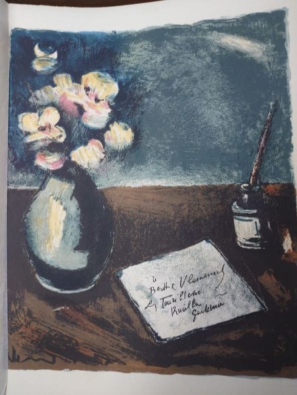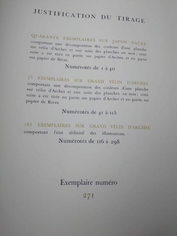 Aux dépens d'un amateur, 1962. In-folio en feuilles, sous chemise et étui cartonné, 99 pages plus achevé d'imprimer. Étui légèrement usé et sali, sinon bel exemplaire. Ex-dono manuscrit sur une page de garde. Édition originale posthume illustrée de 36 compositions originales lithographiées en deux tons ou gravées sur bois, dont la couverture, un portrait frontispice et cinq en couleurs (dont trois sur double page). Tirage limité à 298 exemplaires, un des 183 sur grand vélin d'Arches.