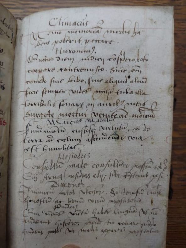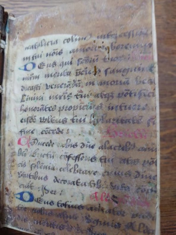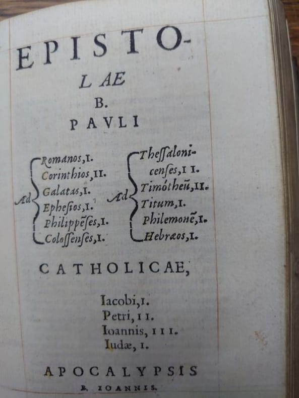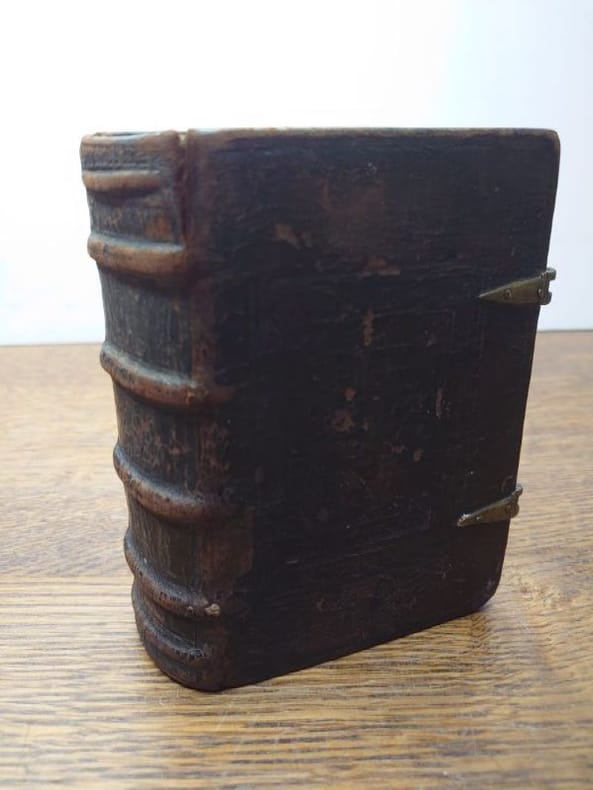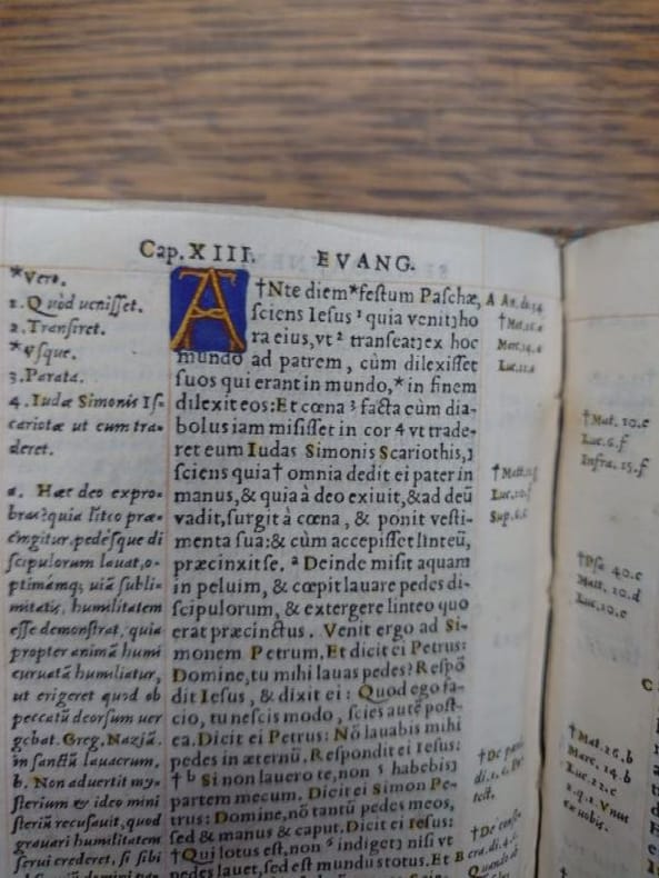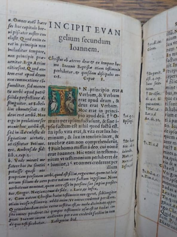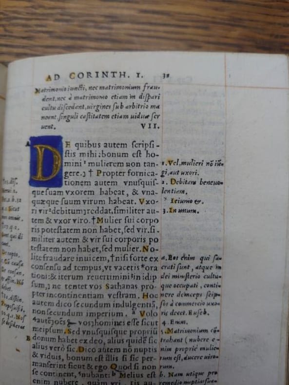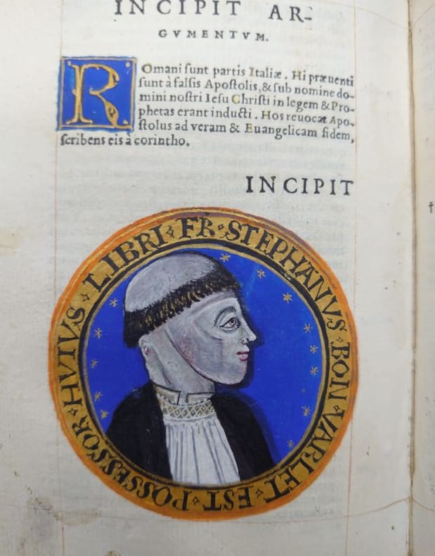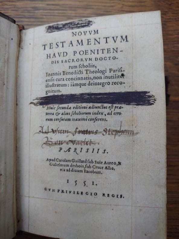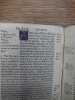 Parisiis. Apud Carolam Guillard sub sole Aureo & Gulielmum Desbois, sub Cruce Alba, via ad diuum Iacobum, 1551. 13,5 x 9 cm, [36]-216-173-[11] folio. Relié plein veau d'époque sur ais de bois, dos à nerfs non titré, décor central à froid sur les plats, fermoirs métalliques et lacets de cuir manquant. Reliure légèrement usée (coins émoussés, un mors fendu sur 2 cm) sinon bon exemplaire bien solide. Pages de garde en parchemin enluminé, une page de garde avec texte manuscrit, deux ex-libris manuscrit sur une page de garde, tampon à froid du Château de Vieusart Corroy-le-Grand. Ex-libris manuscrits sur la page de titre rayés à la plume, quelques annotations manuscrites. Livre entièrement réglé. Toutes les lettrines sont peintes (un peu plus de 300 lettrines). Un portrait peint page folio 4 de la partie Epistolae, portrait ex-libris du Frère Stephanus Bon Varlet. Un dessin sur une page de garde. Vulgate revue par Jean Benoit. Suit la première éd., Paris, Simon de Colines et Galliot Du Pré, 1543. Éd. partagée avec Sébastien Nivelle. Privilège du 22 avril 1551 octroyé à Charlotte Guillard et S. Nivelle. Charlotte Guillard (née v. 1480 - morte en 1557) est un imprimeur français de la première moitié du XVIe siècle. Charlotte Guillard est vraisemblablement née dans le Maine dans les années 1480. Son nom s'écrit parfois Guillart ou en latin, Carola Guillard. En 1502, elle épouse l'imprimeur Berthold Rembolt, associé d'Ulrich Gering, lequel créa la première imprimerie en France ; il tenait boutique rue de la Sorbonne à lenseigne du Soleil dor. En 1508, Gering cesse ses activités, le couple part ensuite s'installer rue Saint-Jacques. Rembolt meurt en 1519, et Charlotte prend seule en charge l'imprimerie, et ce pendant près de quarante ans. Elle se remarie en 1520 avec Claude Chevallon, libraire ouvert aux humanistes. Ses goûts influencèrent les choix éditoriaux de Charlotte dont le catalogue comprend entre autres des uvres d'Érasme, Pacien de Barcelone, Hilaire de Poitiers. Sans enfants, veuve à nouveau en 1537, elle s'associe à ses neveux Jacques Bogard, Guillaume Guillard, Sébastien Nivelle et Guillaume Desboys (ou « des Boys »), qui, tous, débutent au Soleil d'or en tant que libraires. Desboys devient même son associé à compter de 1547. L'entreprise de Charlotte semble être une véritable réussite. On ne lui connaît point de faillite, mais son rôle exact reste difficile à évaluer. Elle savait s'entourer de « chasseurs de textes », spécialistes érudits qui lui rapportaient des manuscrits.