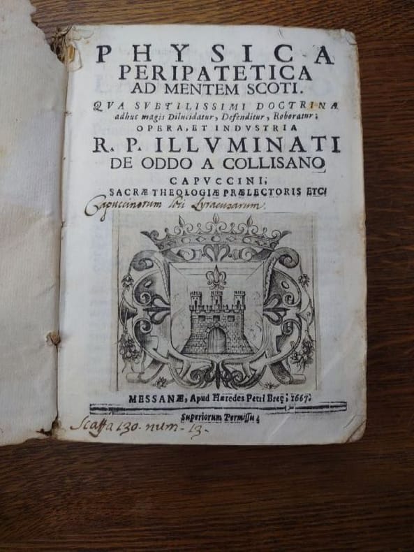 Messanae, Apud Haeredes Petri Breae, 1667. 19 x 14 cm, 776 pp. Relié plein vélin d'époque, dos lisse, titre manuscrit en long. Reliure usée, ouvrage dérelié, mors presque entièrement fendu. Intérieur en bon état. Illuminato Oddo (de son nom civil Giacomo Oddo) était un religieux capucin, théologien et philosophe italien du XVIIe siècle. Né le 23 juillet 1604 à Collesano, en Sicile, décédé en 1683 à Messine. Frère capucin qui a exercé les fonctions de lecteur (professeur), prédicateur au sein de son ordre. Il est principalement connu pour ses écrits philosophiques et théologiques, notamment : Logica peripatetica ad mentem Scoti (Logique péripatéticienne selon l'esprit de Scot). Physica peripatetica ad mentem Scoti (Physique péripatéticienne selon l'esprit de Scot). Disputationes de generatione et corruptione ad mentem Scoti. Ses oeuvres s'inscrivent dans la tradition de la philosophie scolastique, en particulier la doctrine de Jean Duns Scot, qu'il a cherché à clarifier, défendre et renforcer.