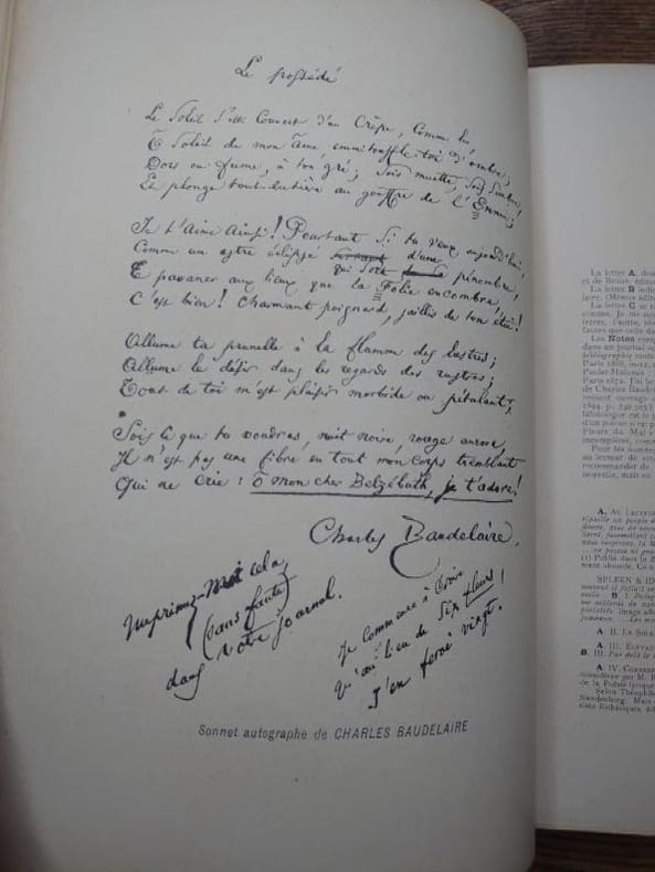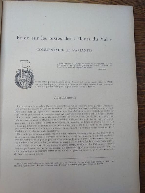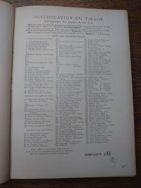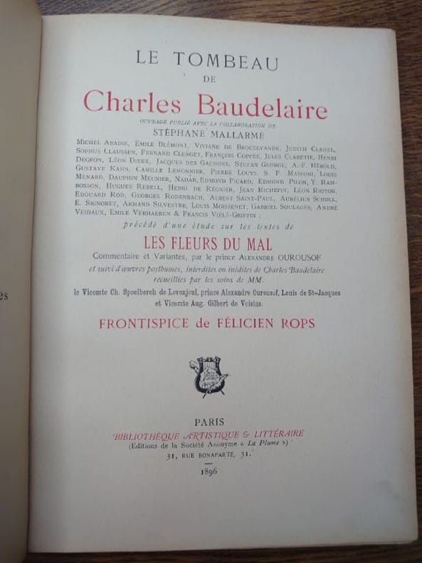 Paris, Bibliothèque artistique & littéraire, 1896. 28 x 20,5 cm, 125 pp. Relié demi chagrin à coins, dos à nerfs, titres dorés, tête dorée. Reliure légèrement usée, traces de frottements. Édition originale de cet ouvrage collectif établi sous la direction de Stéphane Mallarmé. Illustré d'un frontispice de Félicien Rops, du fac-similé d'une page dessinée par Baudelaire, il comprend une importante étude des Fleurs du Mal par A. Ourousof, une trentaine de poèmes en hommage à Baudelaire, en vers signés Mallarmé, Coppée, Hérold, Louys, Régnier, Rodenbach, Richepin..., en prose par Claretie, Jacques des Gachons, Nadar... ; suivent des uvres posthumes inédites, et des notes pour une iconographie. La justification donne la liste détaillée des souscripteurs. Édition originale, un des 200 ex. num. sur vélin d'Angoulême.