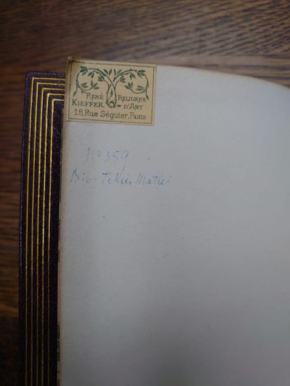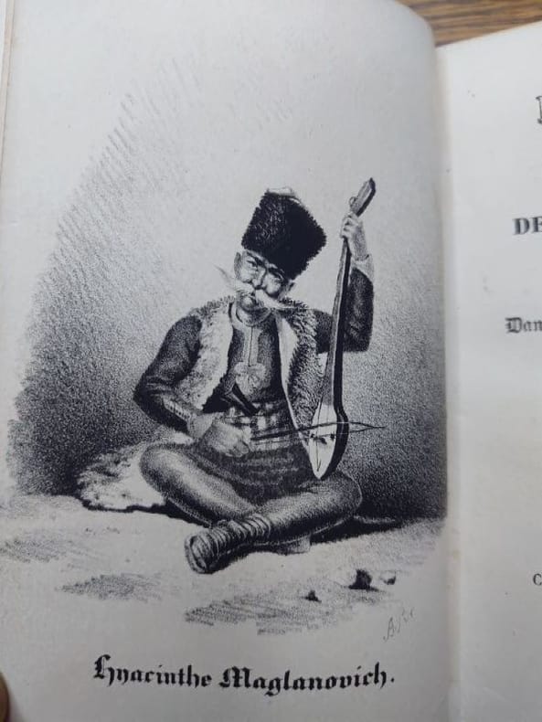 Paris, F.-G. Levrault, 1827. 15,3 x 11 cm, in-12 de xii-257 pp. Relié plein maroquin, dos lisse richement orné de fleurons, titre doré, plats richement décorés d'encadrements de filets et de fleurons, encadrements de cinq filets dorés sur les contreplats, tête dorée. Reliure signée de René Kieffer, avec aussi son étiquette. Quelques infimes traces de frottements, petite déchirure sur la page de faux titre, sinon très bel exemplaire. Édition originale peu courante du deuxième livre de Mérimée, paru anonymement. Frontispice lithographié représentant le poète compositeur (tout à fait imaginaire) Maglanovitch avec son instrument de musique, la guzla. Carteret, II, 136.