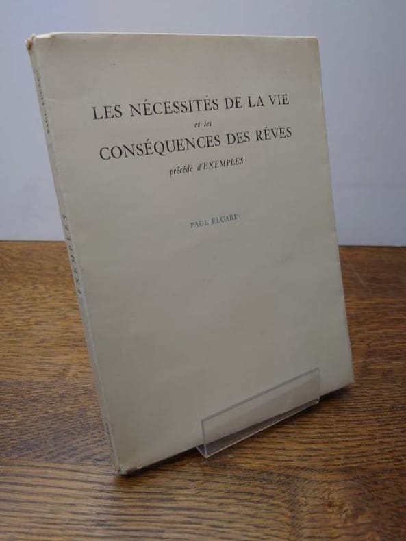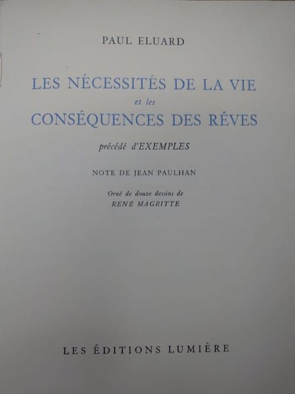 Bruxelles, Éditions Lumière, 1946. 21 x 16 cm, 102 pp. Broché, couverture rempliée, légèrement usée, petite déchirure au dos et tache marginale atteignant 7 feuillets. Nouvelle édition illustré de 12 dessins à la plume de René MAGRITTE reproduits hors texte, dont le portrait d'Eluard en frontispice. Tirage à 512 exemplaires numérotés. Un des 500 sur vélin pur fil. A la demande d'Eluard, l'imprimeur a respecté la disposition typographique de l'originale parue en 1921 au "Sans Pareil".