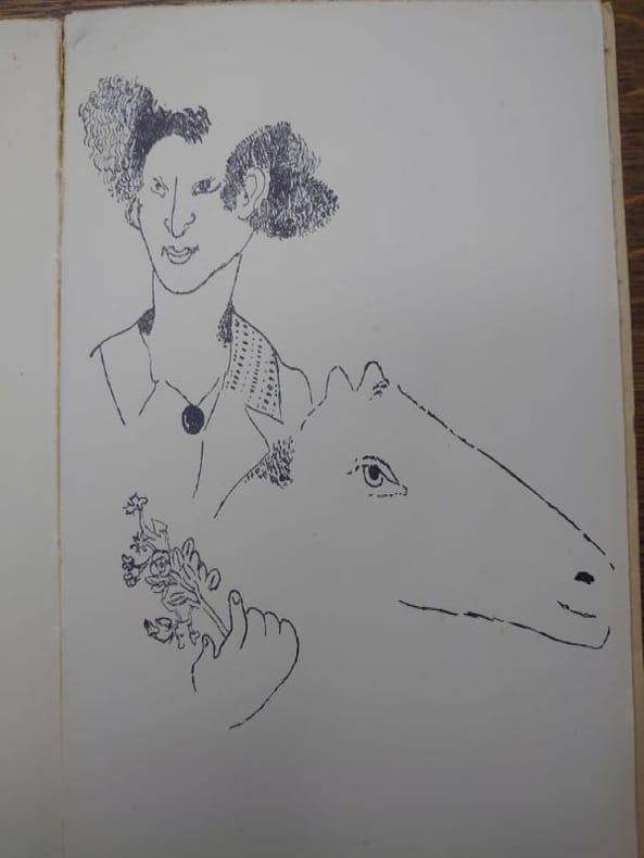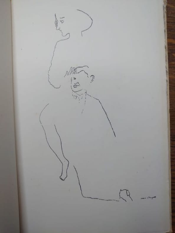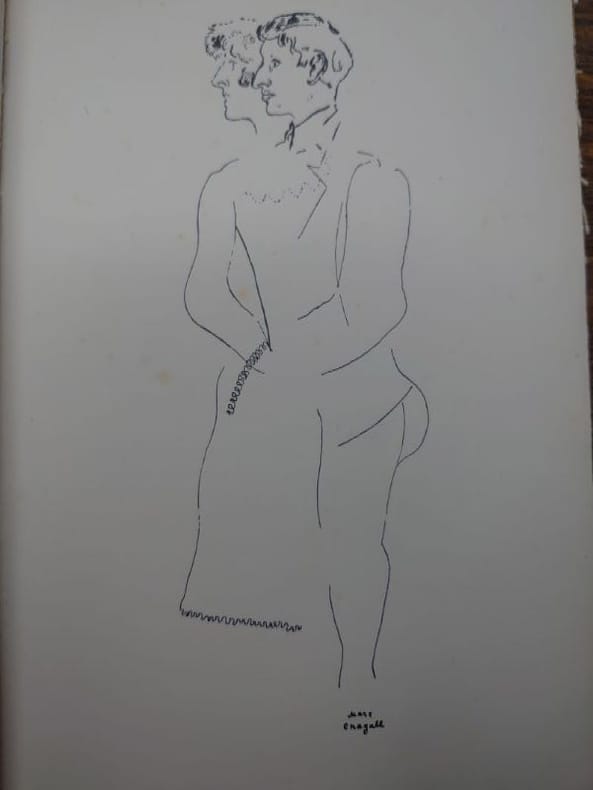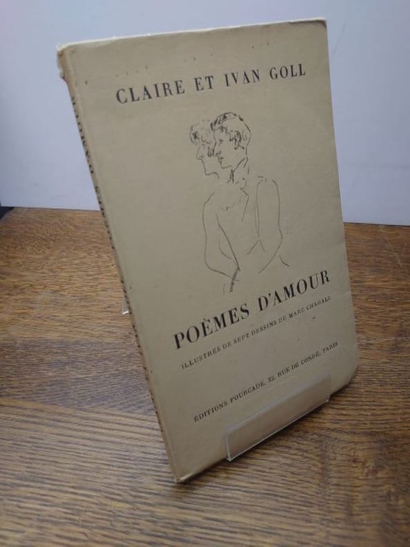 Paris, Éditions Fourcade, 1930. 23 x 14,5 cm, 110 pp. Broché, couverture rempliée légèrement usée, déchirure au dos. Illustré de 7 dessins de Chagall. Un des 850 sur papier bibliophile. L'édition originale date de 1925 mais contient moins de poèmes et de dessins.