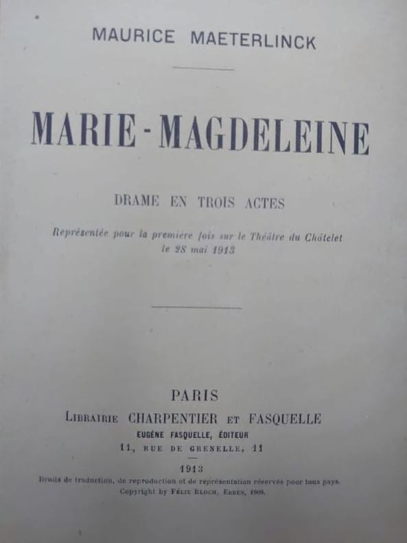 Paris, charpentier et Fasquelle, 1913. 19 x 12 cm, 180 pp. Broché, couverture usé et passée légèrement décollée, sinon bon exemplaire. Édition originale sur papier d'édition. Envoi autographe signé de Maeterlinck à Alfred Sutro (son traducteur anglais).