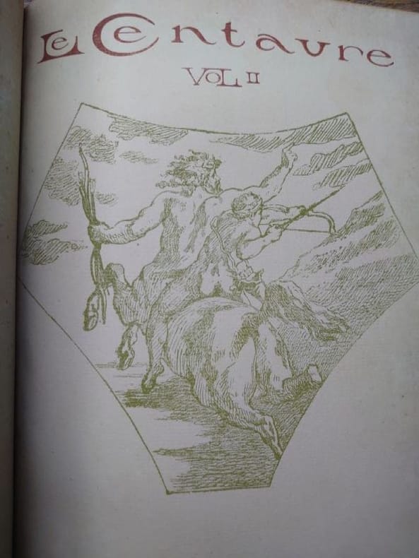 LE CENTAURE est la "revue de jeunes gens à rédaction fermée" qui ne parut qu'en deux numéros. Elle réunissait autour du cercle des fondateurs - Jean de Tinan, Pierre Louÿs, André Lebey et Henri Albert - Henri de Régnier et André-Ferdinand Hérold, Paul Valéry et André Gide.La revue Le Centaure s'inspire de la revue allemande Art Nouveau, dont Henri Albert organisera le supplément Francais, entre mai et décembre 1895. Merci de nous contacter à l'avance si vous souhaitez consulter une référence au sein de notre librairie.