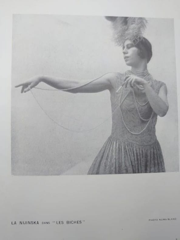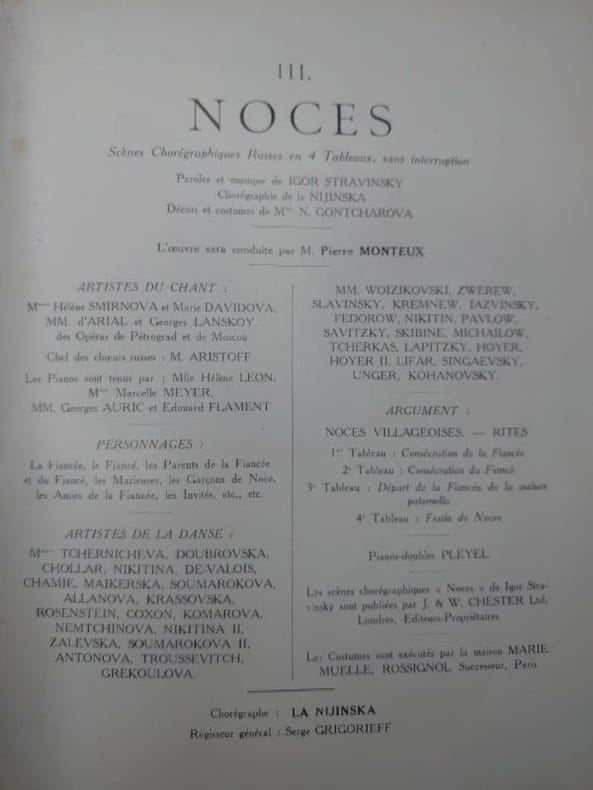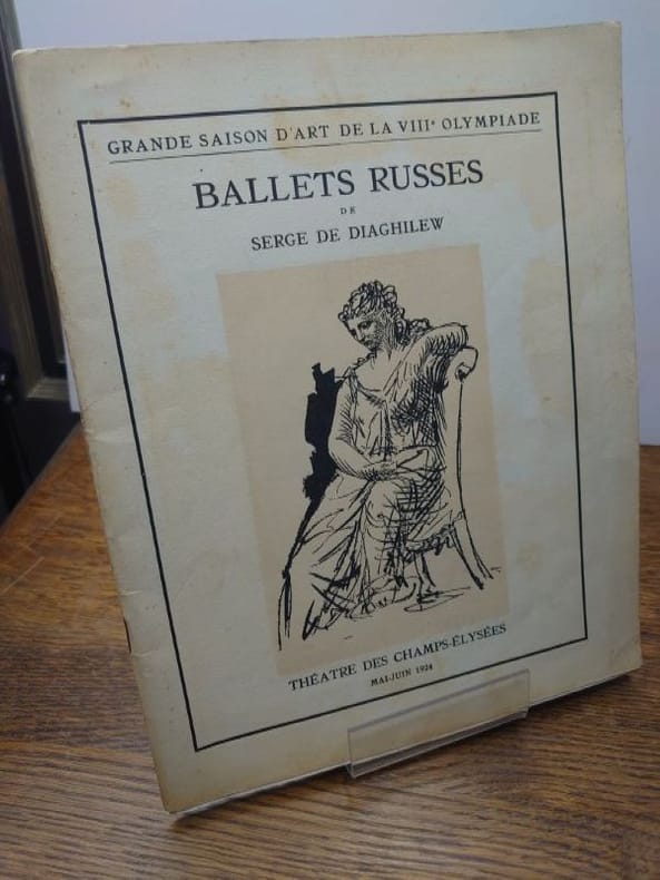 Programme des Ballets russes de Monte-Carlo, dirigé par Serge de Diaghilew, au Théâtre des Champs-Elysées, dans le cadre des Jeux olympiques d'été de 1924. Représentations en mai, juin et juillet, comprenant: Le Train bleu ( Cocteau, Milhaud, Chanel, Laurens) Les Biches (Poulenc, Nijinska, Laurencin), Les Facheux (Kochno, Auric, Braque), Une Éducation manquée (Chabrier, Juan Gris) - Les tentations de la bergère (Monteclair, Juan Gris) - Petrouchka (Stravinsky, Fokine, Benois) - Noces (Cocteau, Massine, Picasso, Satie) - Le Sacre du Printemps (Straninsky, Massine, Roerich) - Pulcinella ( Stravinsky, Massine, Picaso) - Parade (Cocteau, Massine, Picasso, Satie) - Cimarosiana (Cimarosa, Massine). Rideau des ballets russes de Picasso. Couverture et 6 hors-texte de Picasso, dont un en couleurs. Photographies des artistes, des écrivains et des musiciens (Milhaud, Cocteau, Auric, Pollenc, Stravinsky) et reproductions en couleurs des costumes et décors de Marie Laurencin, Juan Gris, Georges Braque. Publicités illustrées en début et fin de la plaquette. Marge raccourcie sans perte sur un feuillet. Couverture & 42 pp. Très bon 0
