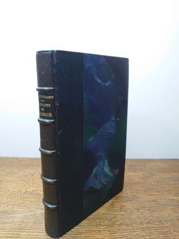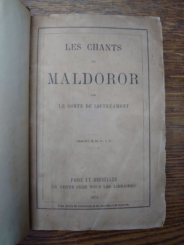 Édition originale de deuxième état de ce chef-d’œuvre du romantisme français (Emond Jaloux). Carteret, II, 503; Clouzot 188; Vicaire, V, 103-104. Cette sorte d’épopée en prose, en 6 chants, fut publiée à Bruxelles par Lacroix et Verboeckoven en 1869. On ne connait que 5 ou 6 exemplaires à cette date. Lacroix céda son stock à un libraire de Bruxelles, Rosez, qui remit en vente la quasi-totalité des exemplaires avec titre et couverture à l’adresse de Paris et Bruxelles et à la date de 1874 «Les exemplaires du deuxième état sont assez rares; leur prix ne cesse de monter». (Clouzot). «Je n’ai pu voir l’édition de 1869 qui est l’édition originale.» (Vicaire). Ce livre magique et torturé est le plus déconcertant de la littérature française. Son thème demeure la rébellion de l’homme contre Dieu. Soupçonné d’être atteint d’aliénation mentale, Lautréamont a cependant conçu une œuvre hallucinante qui s’est acquis un nombre croissant de lecteurs. Edmond Jaloux voit dans cette œuvre «Le chef-d’œuvre du romantisme français». Lautréamont a atteint, en toute certitude, une des limites de la création littéraire. Inventeur d’un style, comme Rimbaud et Mallarmé, il a ouvert une carrière immense à l’imaginaire. «O poulpe au regard de soie! Toi dont l’âme est inséparable de la mienne: toi, le plus beau des habitants du globe terrestre et qui commandes à un sérail de quatre cents ventouses». Revendiqué avec éclat par l’école surréaliste, il est en partie le moteur de l’esprit poétique moderne. Précieux exemplaire à toutes marges, avec témoins, relié avec ses couvertures conservées, de ce livre majeur dans l’histoire de la littérature française.