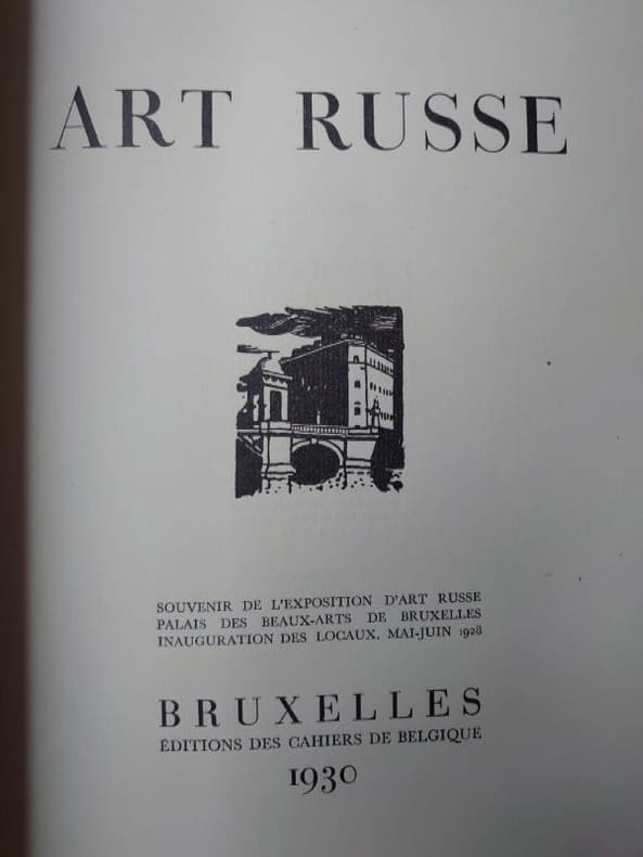 Bruxelles, Editions des Cahiers de Belgique, 1930.Un volume broché (24,5 x 19,5 cm) de 95 pages + 54 illustrations hors-texte. Couverture par Dimitri Bouchene (pochoir). Imprimé à 300 exemplaires numérotés. Couverture légèrement usée et deuxième plat insolé, petit manque angulaire, intérieur en très bon état.A propos des artistes : Leon Bakst, Boris Koustodiev, Alexandre Benois, Serge Soudeikine, Alexandre Golovine, Konstantin Somov, Mstislav Dobuzinski, Basile Schoukhaev, Boris Grigoriev, Natalie Gontcharova, Michel Larionov, Georges Annenkov.Catalogue de l'exposition organisée à l'occasion de l'inauguration du Palais des Beaux-Arts de Bruxelles.