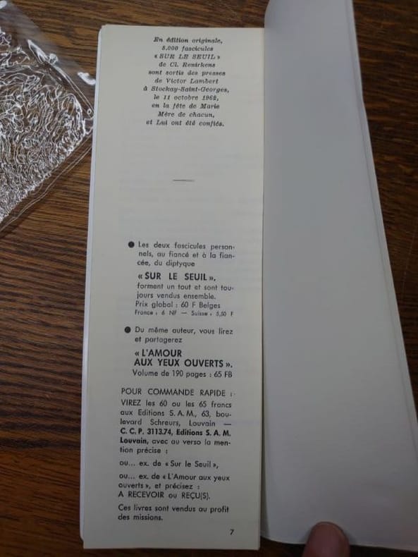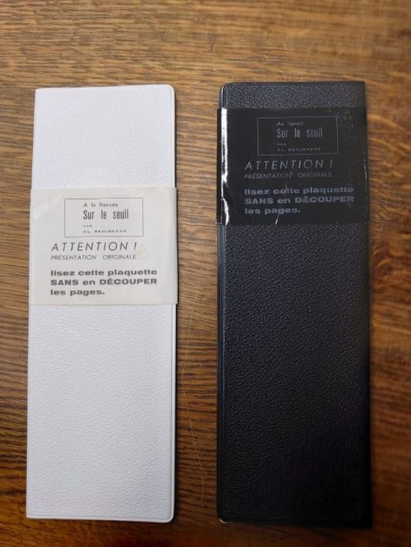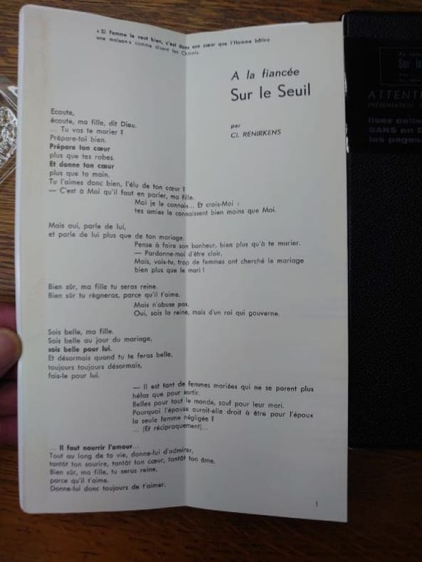 Ed. S.A.M., 1962. Deux curieuses plaquettes sous couvertures plastiques gravées, blanche avec deux anneaux et deux coeurs pour le 1 et noire avec un foyer pour le 2, contenant une feuille double A3 en longueur repliée en accordéon imprimée recto verso. imprimatur J. Heuschen Leodi 4/09/62 sous bandelette. Chaque plaquette dans un étui plastique fermé par un cordon. Beaux exemplaires.