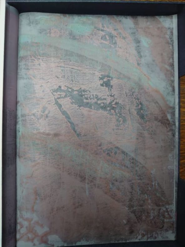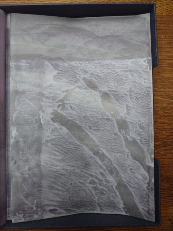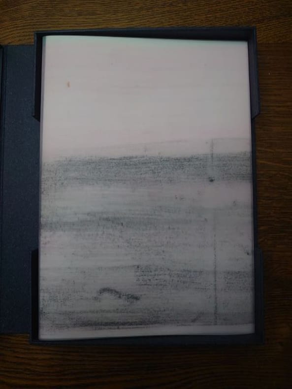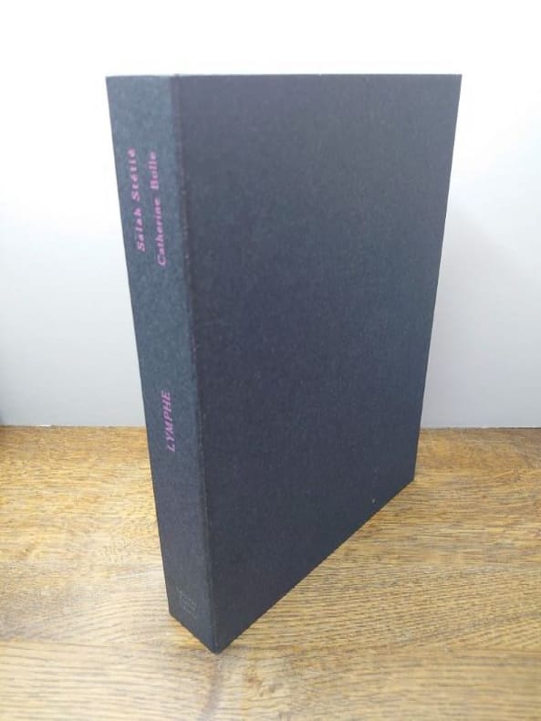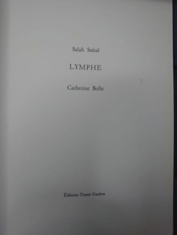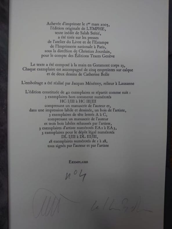 Genève, Editions Traces, 2005. 27,5 x 19,3 cm, non paginé. En feuilles, sous couverture de papier calque illustré, sous emboîtage de l'éditeur réalisé par Jacques Ménetrey, relieur à Lausanne. Texte inédit de Salah Stétié illustré de 5 empreintes sur calque et deux dessins par Catherine Bolle. Un petit accroc sur l'emboîtage sinon très bel exemplaire. Tirage à 40 exemplaires, celui-ci un des 28 exemplaires signés par l'auteur et l'artiste.