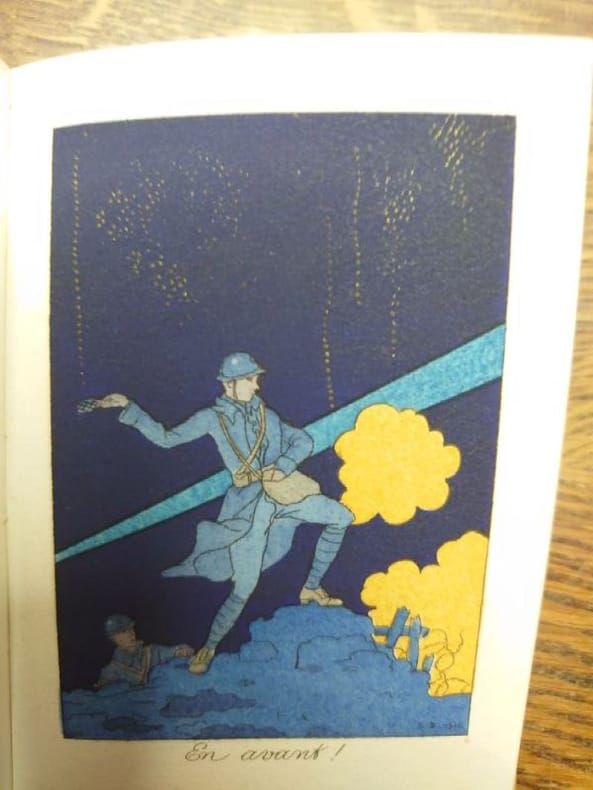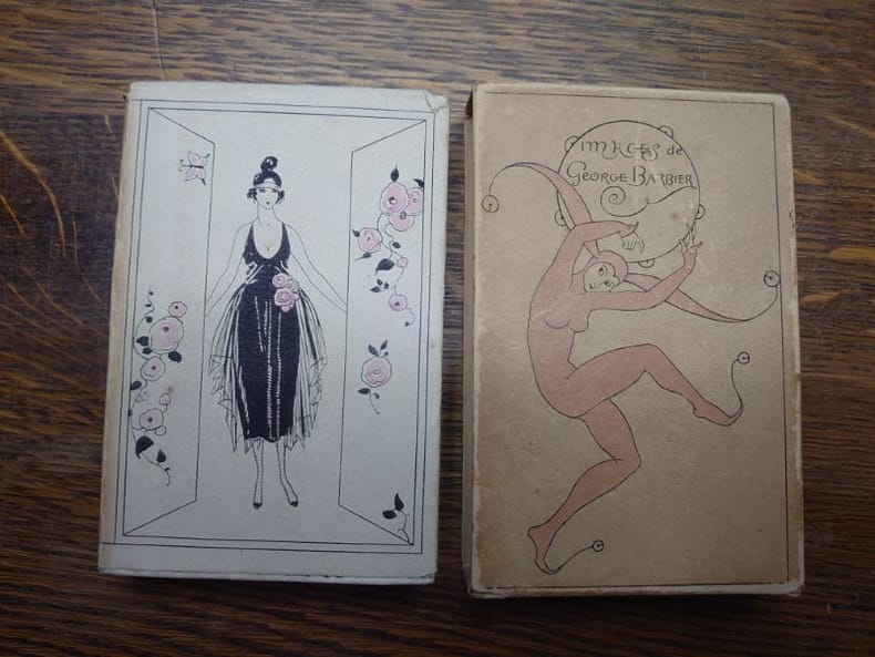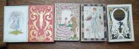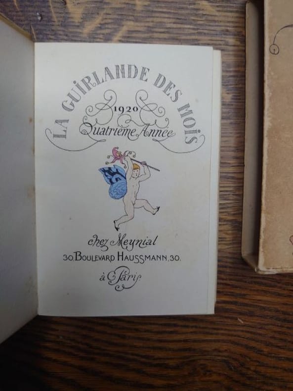 Paris, Meynial, 1917-1921. 12,5 x 8,5 cm, cinq volumes in-24, reliés cartonnage de léditeur satin blanc ou rose orné dun motif doré sur les deux plats daprès une plaque de George Barbier, toutes tranches dorées, sous jaquettes, sous étuis. Collection bien complète illustrée de 31 planches aquarellées au pochoir, et de vignettes dans le texte par George Barbier. Jaquette du tome pour 1917 roussie et corps de l'ouvrage partiellement dérelié, étui du tome 1918 usée avec un manque à la jaquette et dos détaché, étui du tome pour 1919 légèrement usé sinon bel exemplaire, étui du tome pour 1920 roussie et petits manques à la jaquette, étui et jaquette du tome pour 1921 légèrement insolés. Intérieurs de tous les tomes en bel état. Textes inédits de Albert Flament, Henri de Régnier, Gérard dHouville, Francis de Miomandre, Edmond Jaloux, Jean-Louis Vaudoyer, René Boylesve et de la princesse Lucien Murat.