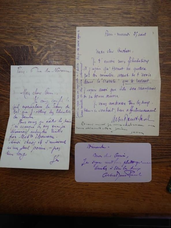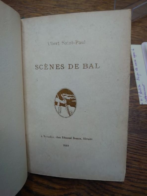 Bruxelles, Deman, 1889. 17 x 11,5 cm, 33 pp. et 1 f.. Relié demi percaline verte à la bradel, fleuron doré, pièce de titre rouge, tête dorée, couvertures conservées, premier plat de couverture imprimé en doré (reliure de l'époque). Édition originale tirée à 150 exemplaires sur Japon. Bel exemplaire enrichi de deux lettres et un billet autographes adressées par l'auteur à Gustave Kahn (1859-1936). Dans la première il lui confie un exemplaire des Scènes de bal annoté en vue d'une récitation par Mademoiselle Thomsen (probablement Jeanne, actrice comme sa soeur Alberte) et le remercie pour l'envoi de son recueil au Mercure de France (certainement Premiers poèmes, 1897, avec une préface sur le vers libre). La seconde, plus tardive est une lettre de félicitations pour sa Légion d'honneur reçue en 1926.