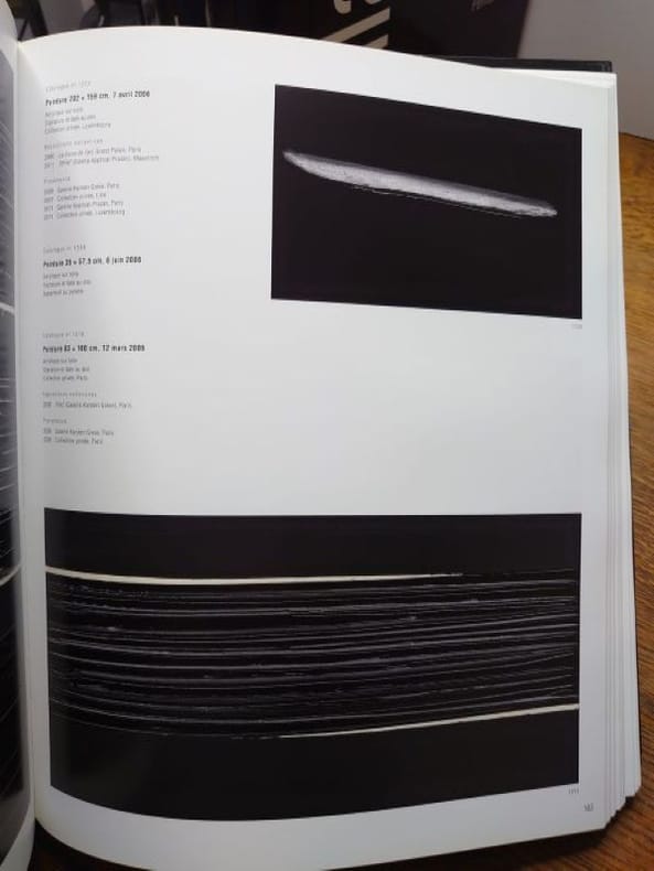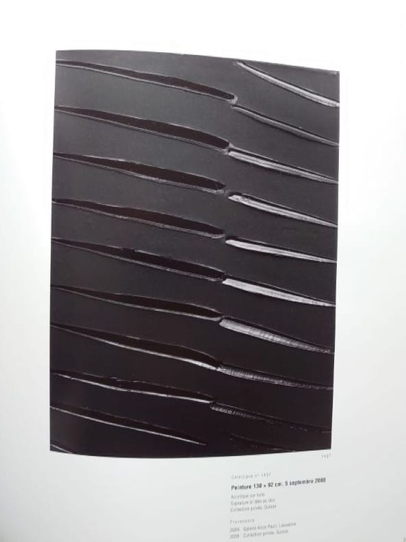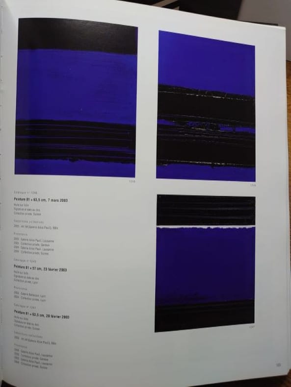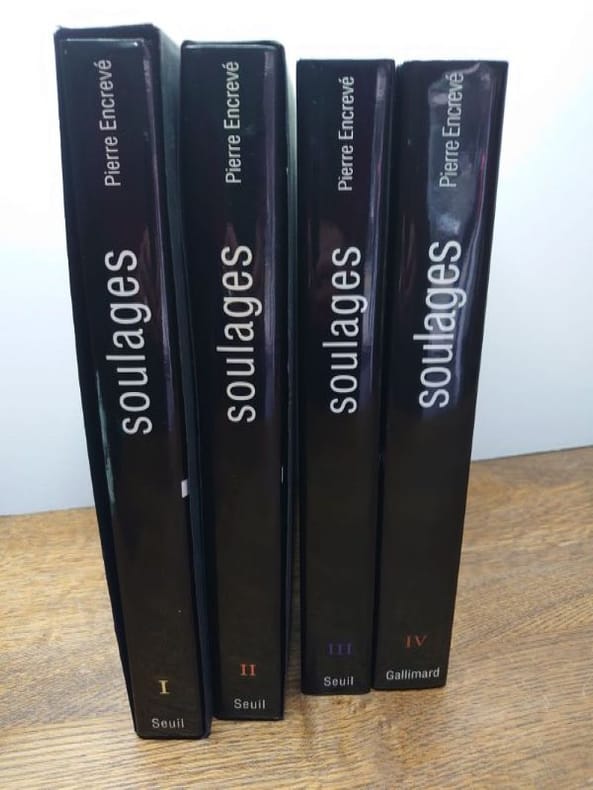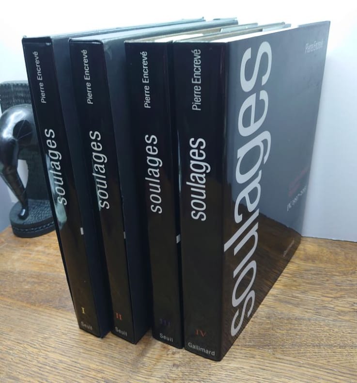 I.1946-1959. Paris, Seuil, 1994. II. 1959-1978. Paris, Seuil, 1995. III. 1979-1997. Paris, Seuil, 1998. IV. 1997-2013. Paris, Gallimard, 2015. I. 31 x 25,5 cm, 314 pp., II. 31 x 25,5 cm, 334 pp., III. 31 x 25,5 cm, 358 pp., IV. 31 x 25,5 cm, 464 pp. Quatre volumes, reliures pleine toile d'éditeur sous jaquettes illustrées imprimées. En très bel état.Ensemble composé des quatre premiers volumes du catalogue raisonné de loeuvre peint du peintre Pierre Soulages ; un cinquième volume a été édité par Gallimard en mai 2025, toujours disponible chez léditeur.Ces quatre volumes couvrent la période de 1946 à 2013. Chaque volume présente de nombreuses reproductions en couleur, des notices détaillées, des textes de Pierre Encrevé, ainsi quune documentation critique et historique sur les techniques, expositions et collections. Pierre Encrevé, directeur détudes à lÉcole des hautes études en sciences sociales, spécialiste de phonologie et de socio-pragmatique, a aussi travaillé sur la peinture contemporaine, tout particulièrement sur loeuvre de Pierre Soulages. Soulages, Loeuvre complet, Peintures, constitue le catalogue raisonné de toutes les toiles de Soulages sous la forme dune sorte de rétrospective intégrale des peintures dont les choix de présentation organisent une vision de loeuvre. La mise en pages et les rapprochements significatifs des reproductions, dans une chronologie relative, veulent en rendre accessibles les liens et raisons internes. Cet ensemble est devenu rare et recherché. Attention ouvrages très volumineux, prévoir des frais de port et d'assurance supplémentaires.
