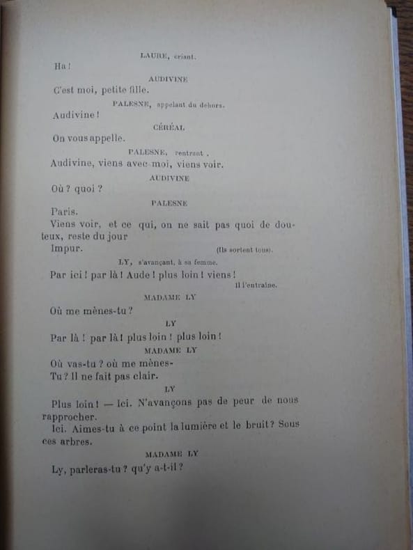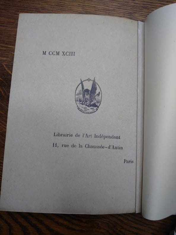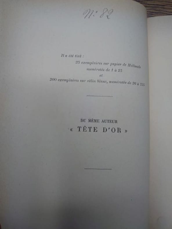 Paris, Librairie de l'Art indépendant, 1893. In-4° (22 x 15,6 cm), 84 pp. n. ch. Reliure en demi-maroquin brun à petits coins rectangulaires, plats décorés de papier Japon teinté gris et bleu de biais, doublures de papier fait main de même se prolongeantsur les gardes volantes, dos lisse, titre argent en long, tête dorée, couvertures et dos conservées. Sous chemise de papier japon gris titré avec une pièce de cuir noir, sous étui bordé [L. Gérard]. En parfait état. Édition originale du deuxième livre de Paul Claudel et première version de cette pièce qui parut anonymement, tout comme Tête d'or (1890), simplement annoncé «du même auteur». Le tirage est de 225 exemplaires, celui-ci n°82 sur vélin blanc (après 25 exemplaires sur Hollande). Élégante reliure signée de Liliane Gérard. Provenance : Liliane Gérard (Bibliothèque personnelle).
