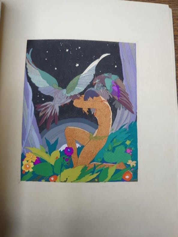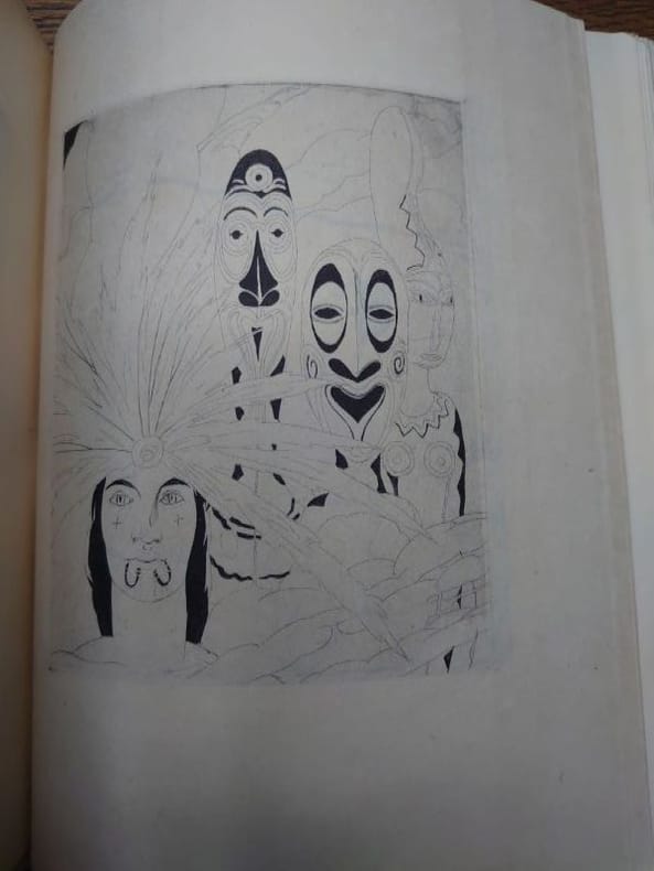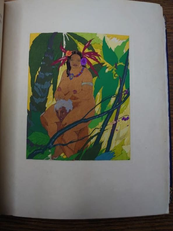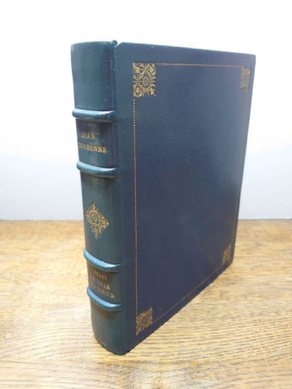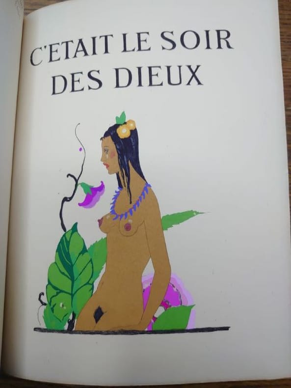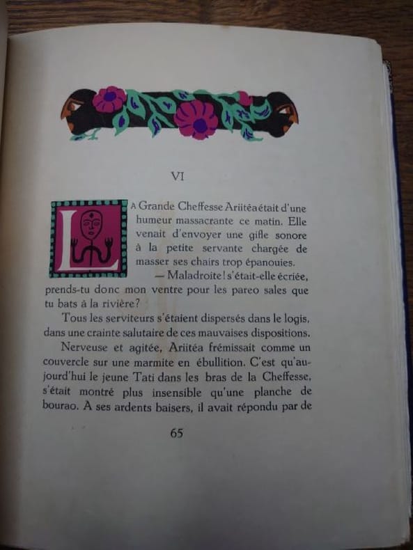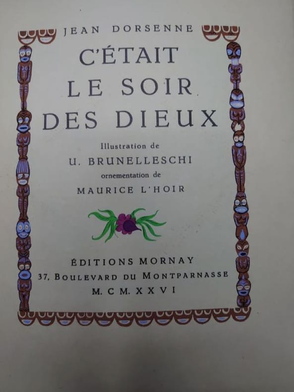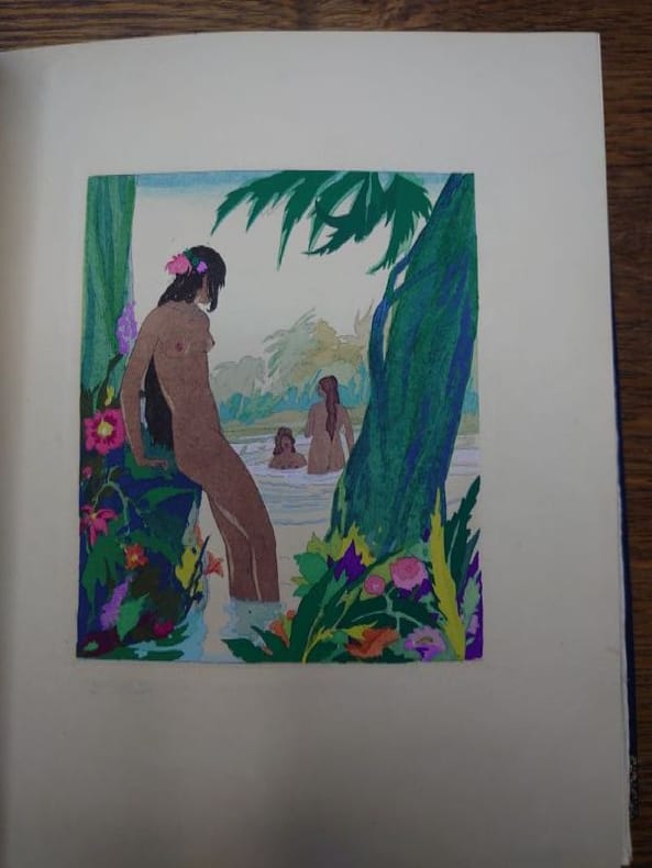 Paris Editions Mornay 1926 In-8, demi-maroquin bleu marine à coins, plats de papier marbré, dos à nerfs ; doublures et gardes de papier marbré, tête dorée, non rogné, couverture illustrée.Cette édition illustrée de ce roman polynésien, comporte 13 compositions en couleurs d'Umberto Brunelleschi (une sur la couverture et 12 hors-texte) et de nombreux ornements tahitiens de Maurice LHoir mis en couleurs au pochoir. Tirage limité à 463 exemplaires numérotés. Un des 350 exemplaires sur hollande à la forme. Quelques rousseurs.