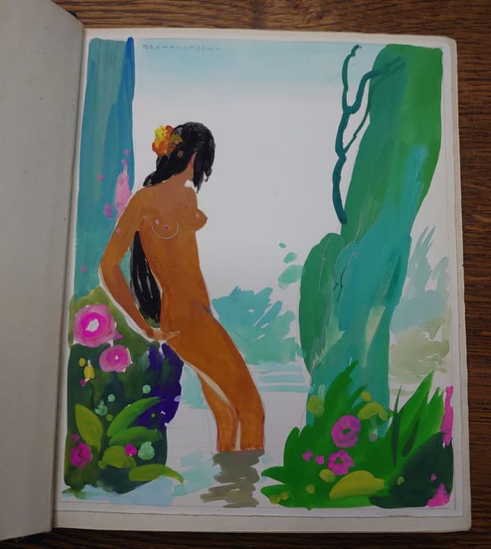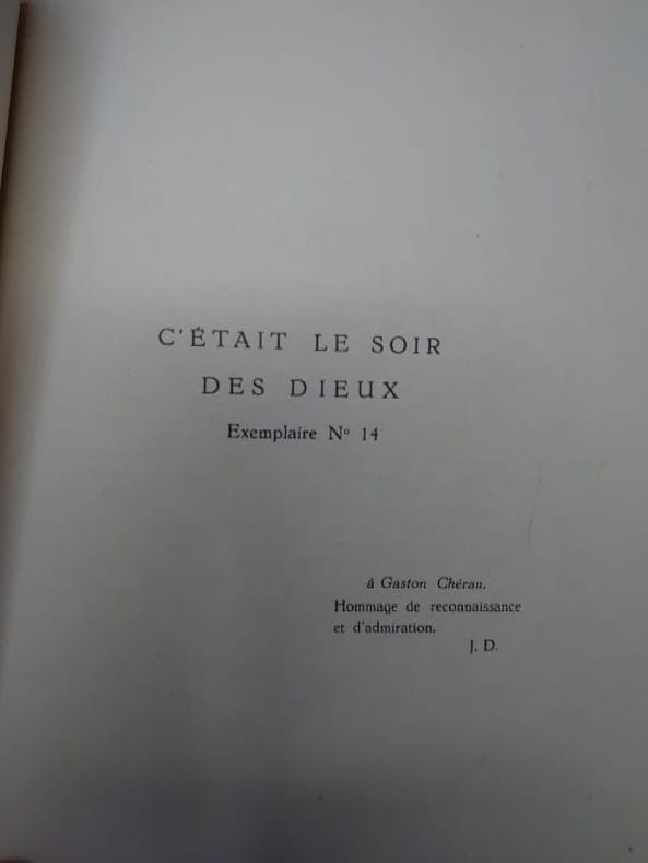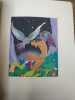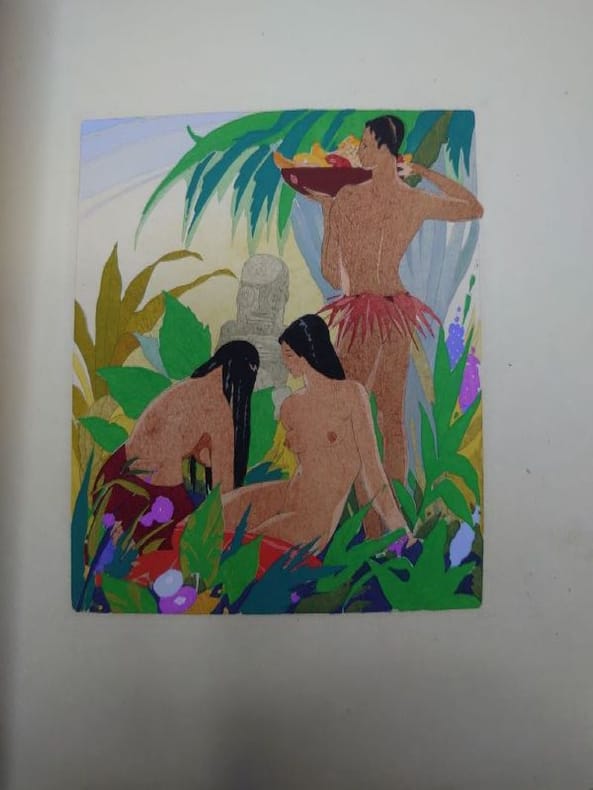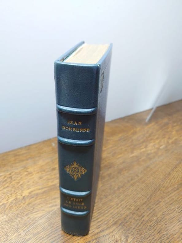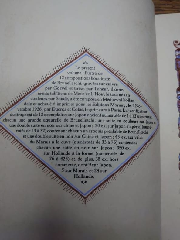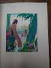 Paris, Éditions Mornay, MCMXXVI [1926]. Fort in-8° (29,5 x 23,5 cm), illustré de 12 compositions hors-texte de Brunelleschi, gravées sur cuivre par Gorvel et dornements tahitiens de Maurice LHoir, le tout mis en couleurs par [Jean] Saudé. Reliure plein chagrin bleu roi, plats décorés aux angles dun fleuron doré reliés par un filet doré, dos à 4 (faux) nerfs formant deux caissons pour lauteur et le titre dorés, millésime en queue du dos, fleuron doréau centre. Les contre-plats sont bordés du même cuir, avec fleuron doré aux angles, encadrant un tissu moiré turquoise, gardes de même moire, doubles gardes de papier marbré. Couverture et dos conservés.Le dos a légèrement pâli. Édition originale tirée à 425 ex numérotés (et 38 H.C.). Un des 20 exemplaires sur Japon impérial (second papier, après 12 ex. sur Japon ancien) contenant un croquis préalable de Brunelleschi (ici, une gouache préparatoire signée pour une des illustrations hors-texte) et une double suite en noir, une sur Japon, une sur Chine. Notre exemplaire est enrichi de 4 gouaches originales de Maurice LHoir, ornements de 4 en-têtes de chapitres. Il faut noter que lillustration de couverture, également gravée et rehaussée au pochoir, est supplémentaire aux 12 illustrations annoncées. Elle ne fait pas partie des suites en noir. Livre art déco peu commun en tirage de tête avec une gouache originale dUmberto Brunelleschi.