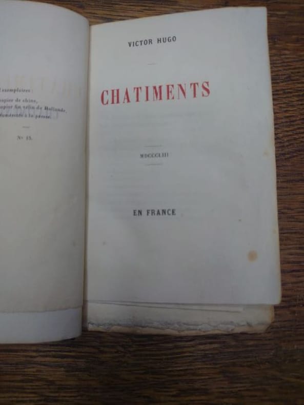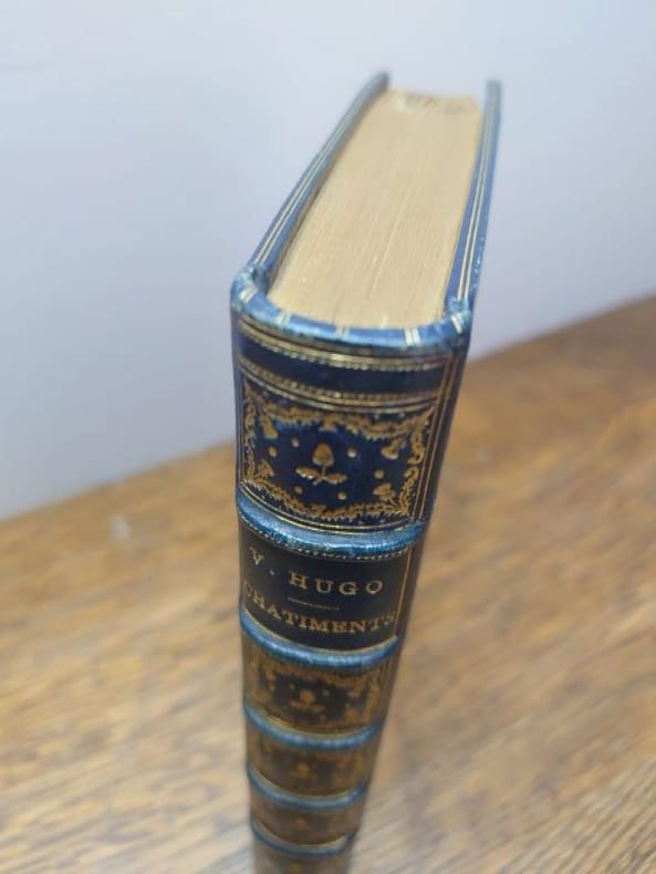 En France, MDCCCLIII (1853). 15 x 9,5 cm, 1 f. (faux titre et au dos justification du tirage), 1 f. (page de titre), 3 pp. (préface signée V.H.), 392 pp. Relié plein maroquin bleu, dos à nerfs, caissons ornés, titre doré, tête dorée, encadrements de triple filets dorés sur les plats, encadrement de roulettes dorées sur les contreplats, filets dorés sur les coupes et les coiffes, couvertures non conservées. Traces de frottements et très légères éraflures, coins légèrement frottés sinon bel exemplaire. Tirage à 22 exemplaires numérotés : 6 sur papier de Chine et 16 sur papier fin vélin de Hollande. Notre exemplaire est un des 16 exemplaires sur vélin de Hollande (15). Exemplaire non rogné. Rare édition originale sur grand papier. Il existe deux éditions des Châtiments, toutes deux parues en 1853 à Bruxelles, chez le même éditeur et à la même imprimerie : l'une au format in-16, « tronquée » ou « mutilée » dit Hugo dans l'avant-propos, parce que les passages virulents et les noms des personnages attaqués par le poète en ont été expurgés ; l'autre au format in-32, complète et clandestine, dont le Dr Flavien Michaux a prouvé qu'elle est la première parue, la seule corrigée par Hugo et « incontestablement l'originale ». Un des seize exemplaires imprimés sur vélin fin de Hollande. Il n'a été tiré que vingt-deux exemplaires en grand papier de cette édition : six sur chine et seize sur hollande. Provenant tous du second et plus beau tirage de l'édition, ils présentent un titre différent de celui des exemplaires ordinaires, imprimé en rouge et noir, avec la mention En France comme lieu de publication, au lieu de Genève et New York. Sa composition est celle de lédition dite de Genève et New-York, dont le texte a été réimposé. (Réf : Vicaire, Manuel de l'amateur de Livres du XIXème siècle, tome IV, col. 312 et 313).
