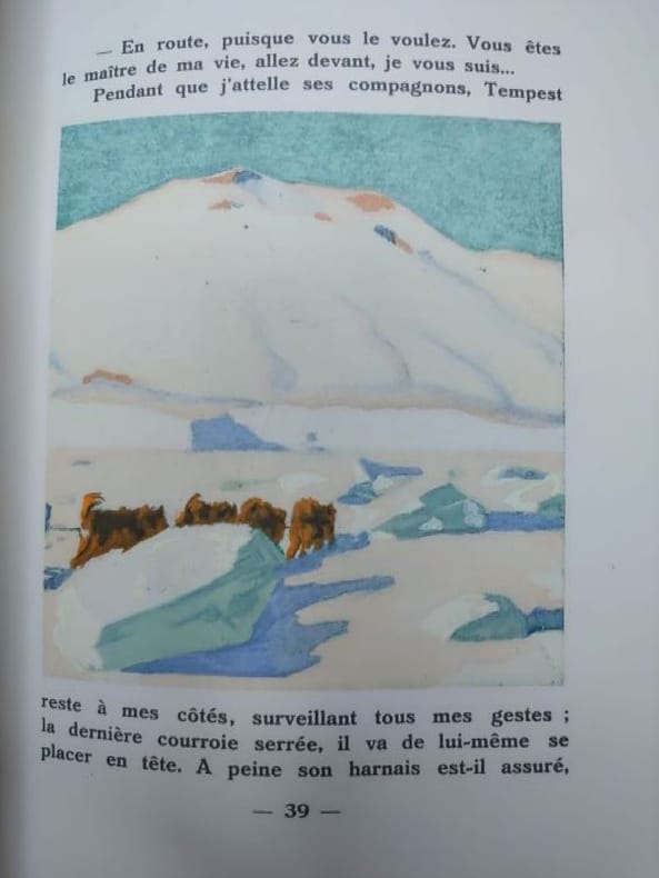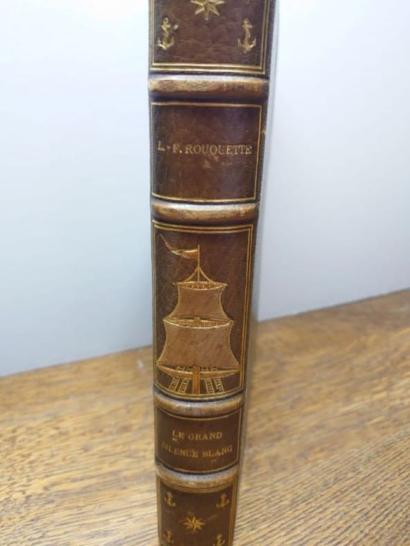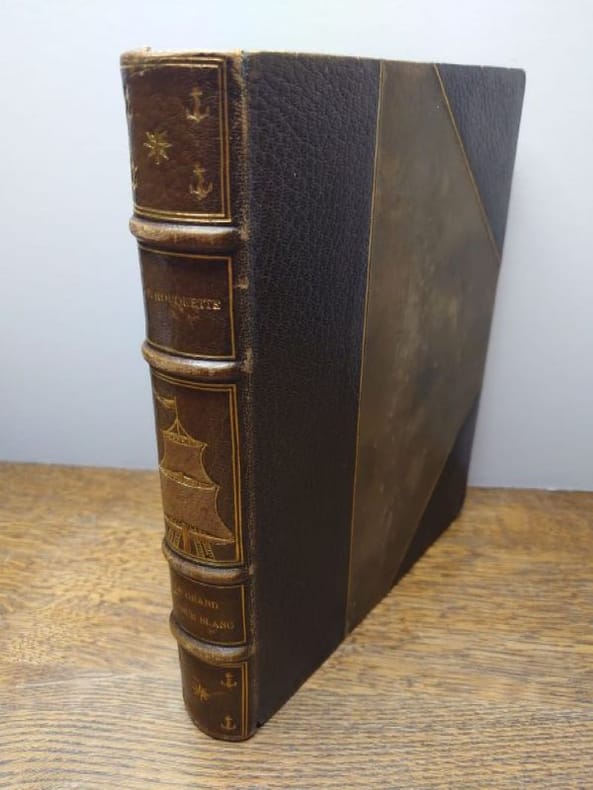 Mornay, Paris, 1928. Un volume in-4° carré, 25,5 x 21 cm, de 237 pages. Relié demi maroquin à coins, dos à nerfs, caissons ornés de motifs dorés et d'un décor de voile de bateau mosaïqué, titre doré, tête dorée, couvertures et dos conservés (reliure signée Weckesser). Nombreuses traces de frottement, épidermures, coin usés, sinon bon exemplaire. Couverture illustrée d'une grande composition en couleur. 123 superbes compositions, vignette de titre, frontispice, très nombreuses lettrines, culs-de-lampe et ornements, rehaussées à la main à la gouache et à l'aquarelle de Clarence GAGNON. Tirage limité à 725 exemplaires numérotés, celui-ci un des 650 sur Rives.
