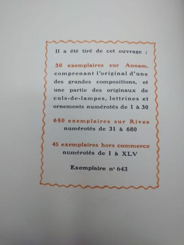 Paris Éditions MORNAY 1928 un volume in-4°, (10) 237 pp., couverture crème illustrée en couleur. (entaille de 5cm en milieu de couverture, dos fendu en trois endroits, bruni en queue et comportant trois petits manques de papier). 123 compositions ( vignette de titre, frontispice, très nombreuses lettrines, culs-de-lampe et ornements ) rehaussées à la main à la gouache et à l'aquarelle de Clarence GAGNON. Un des plus beaux livres publiés aux éditions Mornay. Tirage limité à 725 exemplaires numérotés, un des 650 sur Rives (n° 288). Intérieur très frais. Exemplaire à relier.