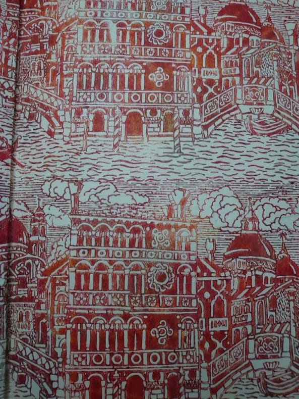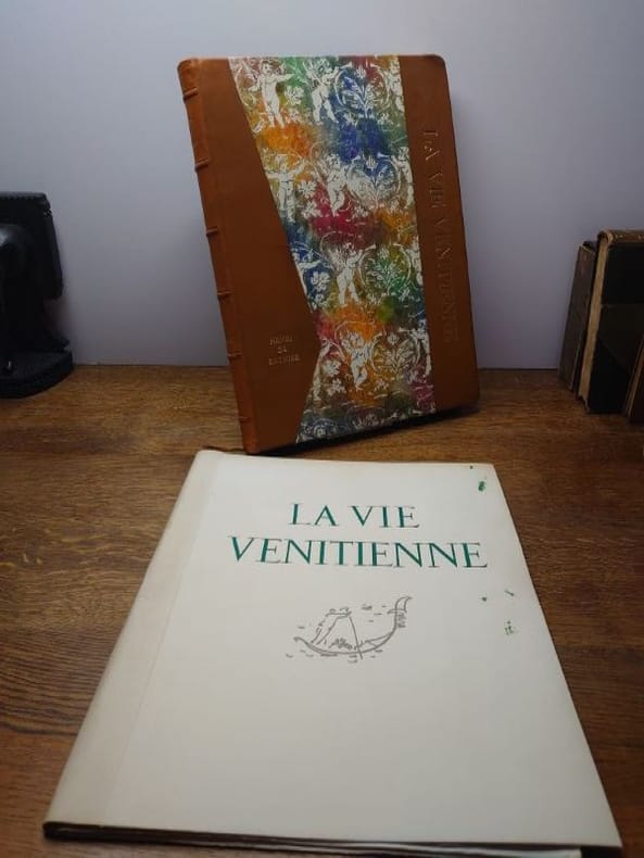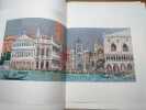 Paris, Rombaldi, Les presses du compagnonnage, 1959. Grand in-4, (42 cm x 32), en feuilles, couverture blanche imprimée, illustrée et rempliée, chemise et emboitage de luxe en daim rouge vif illustré d'une large plaque dorée incisée sur le plat réprésentant le Lion de St Marc, dos à nerfs ornés de filets dorés et de quatre médaillons dorés avec le même lion, titre et nom d'auteur en lettres dorées. Etui signé M. POINCON O'.