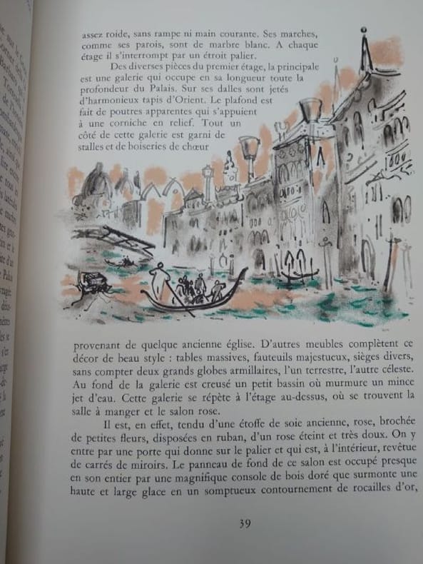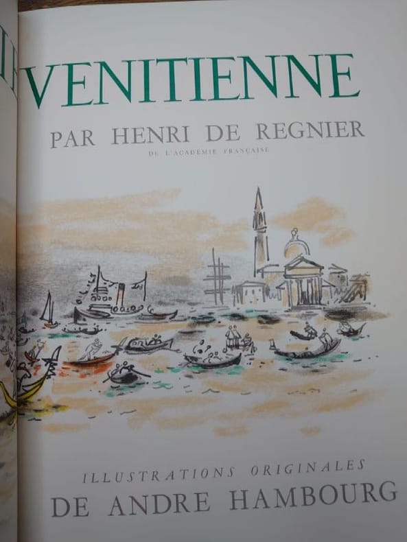 39 illustrations originales en couleurs dont 5 à double-page, 9 dessins en un ton et 79 vignettes en noir. Tirage limité à 231 exemplaires. Un des 40 ex numérotés sur pur fil d' Arches (n° 49) comprenant une épreuve sur soie d'un hors texte, UNE SUITE SUR PUR FIL DE HOLLANDE et la décomposition d'un hors texte. Les illustrations ont été gravées sur bois en couleurs par Gérard Angiolini et Gilbert Rougeaux. Elle a été réalisée, pour les gravures et le texte, par l'imprimerie du compagnonnage. Exemplaire enrichi d'un ENVOI AUTOGRAPHE signé de André HAMBOURG AVEC UN DESSIN ORIGINAL d'un gondolier. Très bel exemplaire. Photos sur demande.