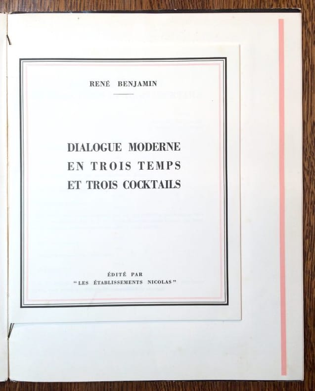 établissements Nicolas 1931 In-4. Broché, couverture rose et noir, 24 pp., 10 planches, complet de la brochure “Un dialogue moderne en trois temps et trois cocktails” 16 pp. Couvertur frottée et effrangée, intérieur frais.