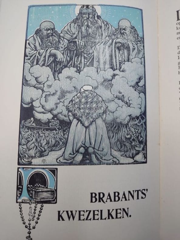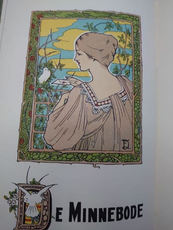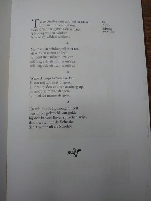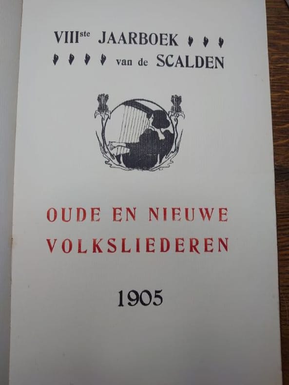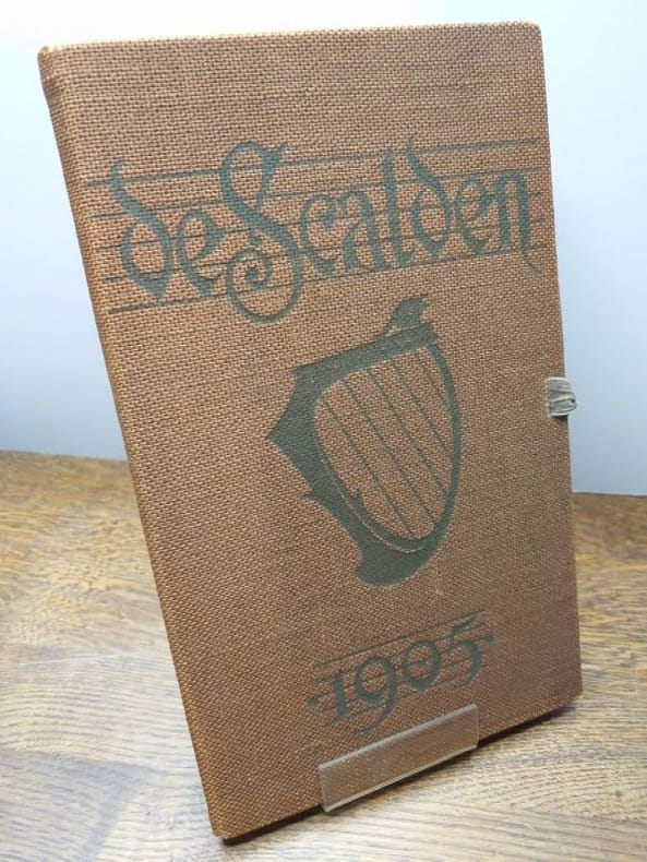 Anvers, De Scalden, 1905. 30,5 x 19 cm, 64 pp. Broché couverture de papier marbrée d'origine dans une chemise en toile décorée, fermée par un lacet en tissu. Chemise très légèrement usée sinon bel exemplaire. « VIIIème Annuaire des Scalden ». Contributions textuelles de Hoffmann von Fallersleben, Frans de Cort, Ph. van Duyse, J.M. Dautzenberg, Pol de Mont, entre autres. Planches lithographiques en couleurs « hors-texte » d'Edmond van Offel, Lod. Verhees, Em. Delrue, J. Posenaer, Eug. Van Mieghem, Audiens, Edward Pellens, R. Bosiers, J. van Wijck, Walter Vaes, C. de Beuckelaer, Elliott, V. van der Veken, Fr. Proost. Imprimé par De Vos & Van der Groen ; lithographies imprimées par J. van Tendeloo.