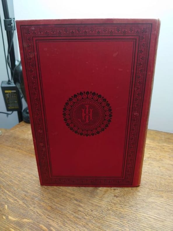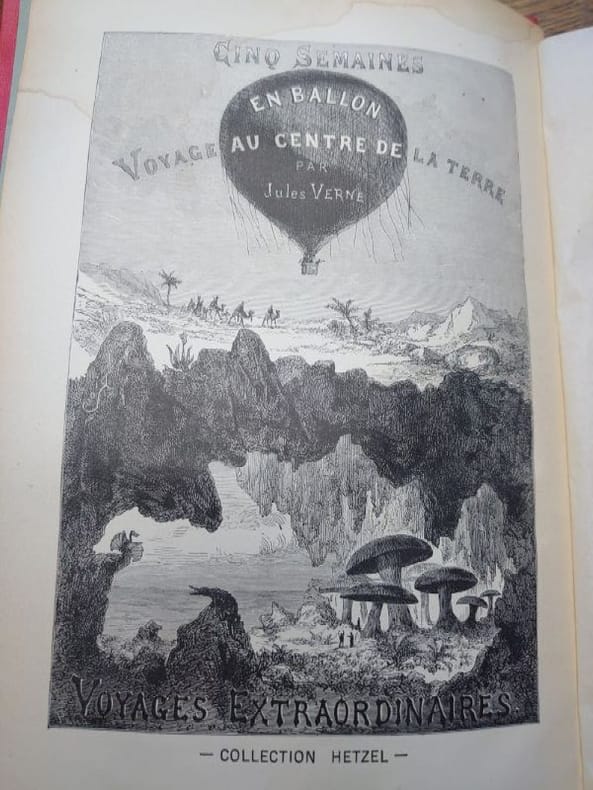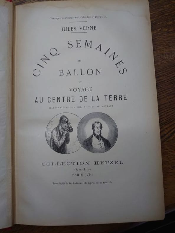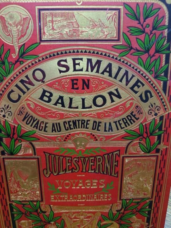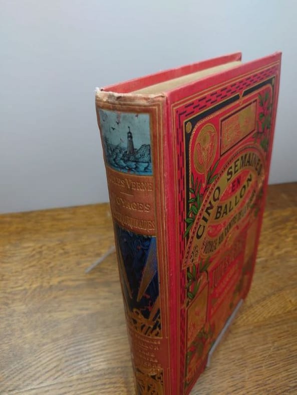 Hetzel, Paris, s. d.28 x 18 cm, 267 et 220 pp. Cartonnage éditeur Hetzel "à l'éventail et à l'éléphant" en pleine percaline rouge signé Engel, premier plat polychrome signé Engel présentant le titre dans l'éventail noir et doré, plusieurs encadrements en noir et à l'or, une tête d'éléphant dorée en haut à gauche, trois petites illustrations ainsi que divers instruments de navigation et d'exploration dorés, le tout encadré dans des feuillages verts, second plat de type jh, dos au phare orné de plusieurs illustrations en couleur et à l'or, pages de garde bleues d'origine, toutes tranches dorées. Dos légèrement passé, coiffes légèrement affaissées, coins légèrement émoussés, deuxième plat passé sur les bords, mouillures marginales au coin des dernières pages du deuxième texte.