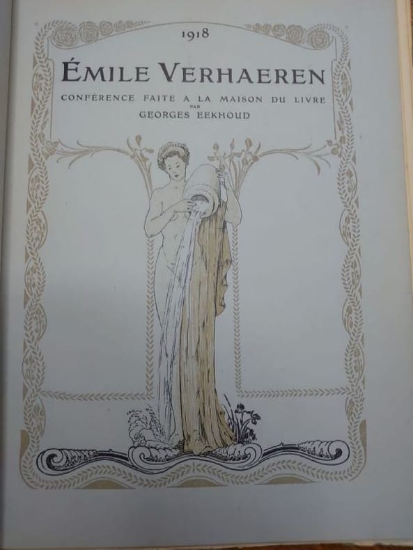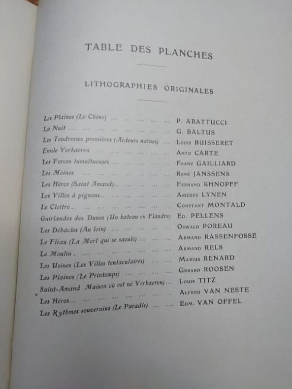Bruxelles, Maison du Livre, 1918. 29 x 21,5 cm, 27 pages et 18 planches. Broché et en feuilles pour les planches. Couverture légèrement passée quelques rousseurs sinon bon exemplaire. Ornementation du texte par Gérard Roosen. Illustré de 18 lithographies originales en noir ou en couleurs dont Anto Carte, Fernand Khnopff, Armand Rassenfosse, Oswald Poreau, Amédée Lynen. Tirage limité à 750 exemplaires numérotés, un des 690 sur vélin gris.