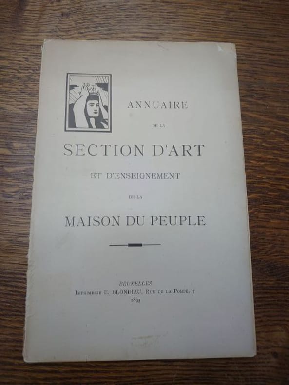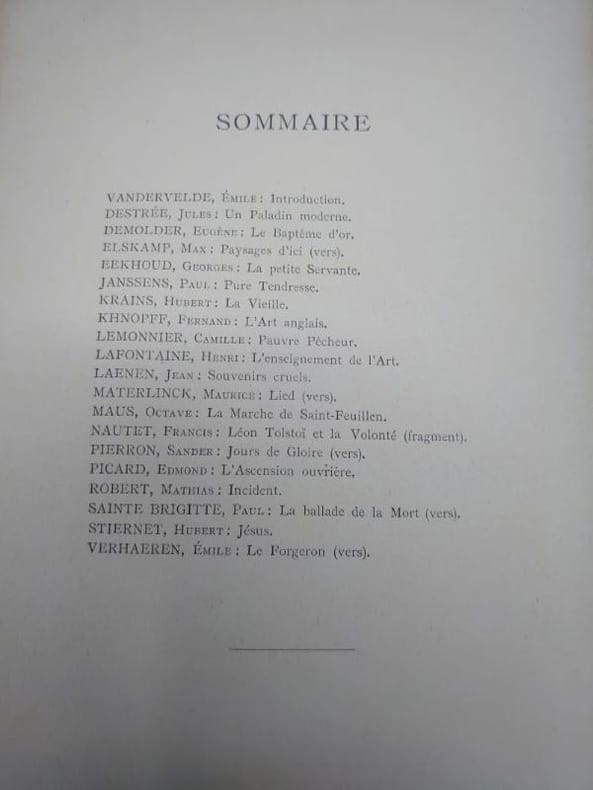 Bruxelles, Imprimerie E. Blondiau, 1893. 24 x 16 cm, 76 pp. Broché, couverture légèrement usée, déchirure au dos et petit manque en haut de la couverture. Textes de : Destrée, Elskamp, Eekhoud, Lemonnier, Picard... Dessin de couverture de Fernand Khnopff.