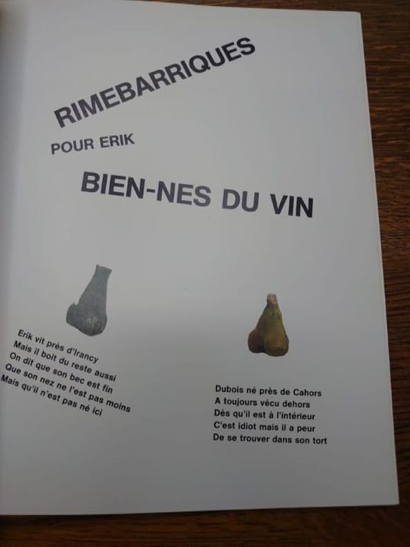 Editions Lebeer-Hossmann, Bruxelles/Hambourg/Paris, 1990. In-8, broché sous couverture rempliée et illustrée, 44 pp. Blason du blase, par Michel Nuridsany - Rimebarriques pour Erik Biens-Nés du vin, par Roland Topor - Planches - Le nez du vin, par Jean Lenoir - Planches.