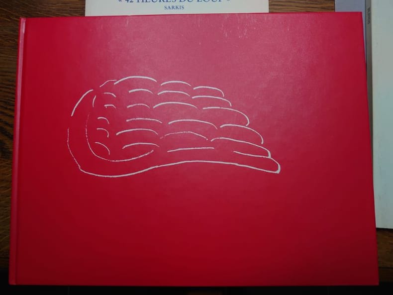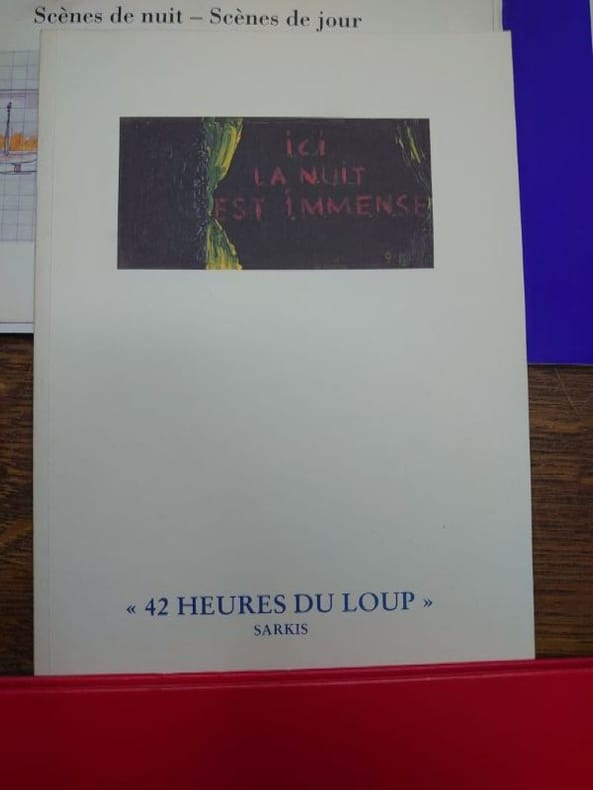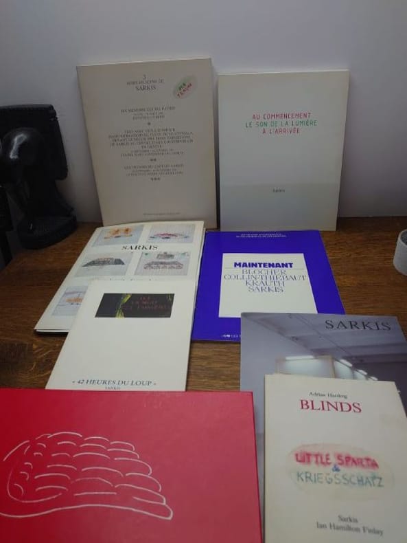 Nous avons : - Little Sparta & Kriegsshatz. Sarkis et Ian Hamilton Finlay. Lebeer Hossmann, 1985. - Point de rencontre : le rêve. Sélestat, 1993. - "42 heures du loup". Nantes, Musée des Beaux-Arts, 1989. Avec un envoi autographe signé de l'artiste. - Les 7 Trésors de guerre de La Réunion. Saint-Denis de La Réunion, 1994. - Scènes de nuit - Scènes de jour. Centre national d'art contemporain de Grenoble, 1991. Avec un envoi autographe signé de l'artiste. - Au commencement le son de la lumière à l'arrivée. Musée des beaux-arts de Nantes, 1997. - 3 mises en scène de Sarkis. Ma mémoire est ma patrie. Trio avec Viola d'amour. Les trésors du Captain Sarkis. Editions Lebeer Hossmann, 1985. - Maintenant. Blocher, Collin-Thiébaut, Krauth, Sarkis. Les musées de la ville de Strasbourg, 1987. Et quelques cartons d'invitation.