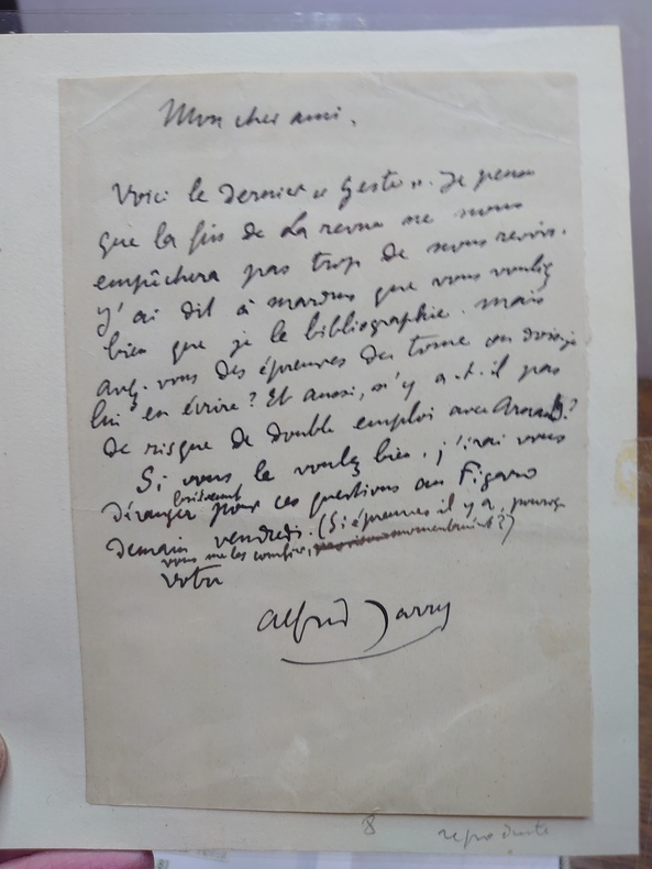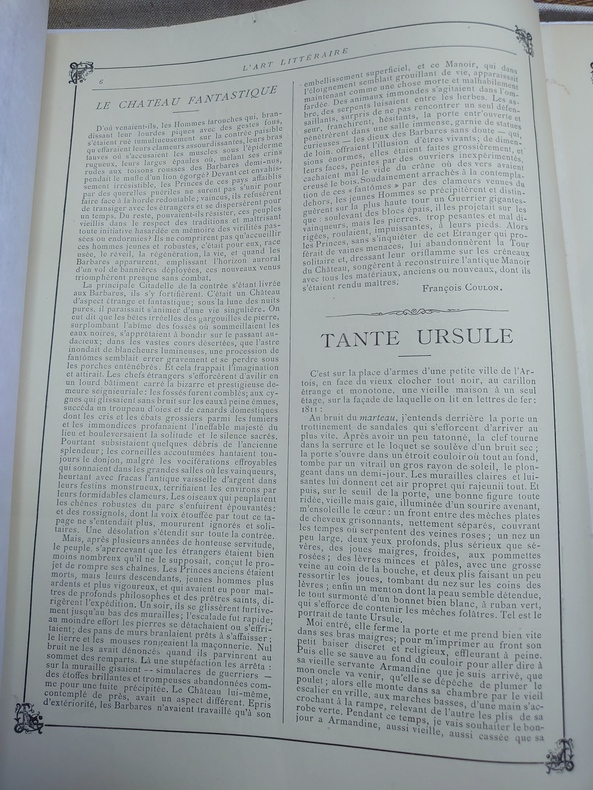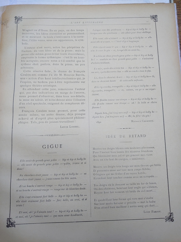 Paris, Rédacteur en chef : Louis Lormel. N° 1, octobre 1892 au n° 13, décembre 1893. Nouvelle série : n° 1-2, janvier-février 1894 au n° 11-12, novembre-décembre 1894. Textes de Émile Bernard, François Coulon, Maurice Cremnitz, Léon-Paul Fargue, André Fontainas, René Ghil, André Gide, Remy de Gourmont, Alfred Jarry, Henri Jeannin, Gustave Kahn, Tristan Klingsor, Louis Lormel, Stéphane Mallarmé, Camille Mauclair, Albert Mockel, Edmond Pilon, Henri de Régnier, Saint-Pol Roux, etc.Illustrations de Émile Bernard, Maurice Denis, Fabien Launay, Alexandre Séon.Collection complète. 13 numéros en 13 livraisons in-4 en feuilles et 12 numéros en 6 livraisons in-8 brochées, sous emboîtage. Les exemplaires ont été désacidifiés puis renforcés à la pliure. Une lettre autographe signée dAlfred Jarry à Félix Fénéon, s.d. [décembre 1902] : Il envoie la dernière partie de « Geste » et sentretient ensuite dune bibliographie du Dr Mardrus.