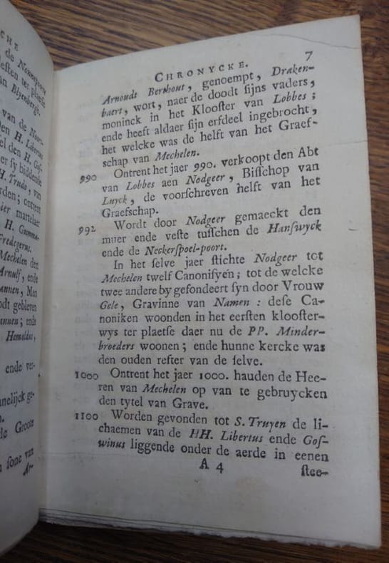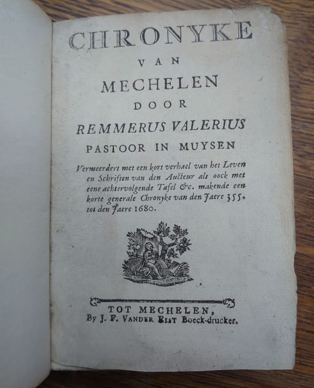 Tot Mechelen, By J.F. Vander, sans date [1680]. 15,5 x 11 cm, xlviii - 191 pp. Reliure plein vélin, dos lisse muet. Bel exemplaire. Recueil retraçant l'histoire de Malines de 355 après J.-C. à 1680, rédigé par Remigius Wouters (Remmerus Valerius) (vers 1636-1685). Texte en néerlandais.