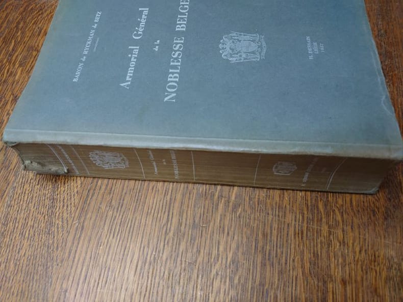 H. Dessain, Éditeur, Liège, 1957.Un fort volume broché (21 x 28 cm) de xiii-769 pp. Couverture en papier fort. Couverture usée, une déchirure au dos et dos passé, intérieur en bon état. Un des 500 exemplaires numérotés. Très nombreuses reproductions d'armoiries en noir et blanc.