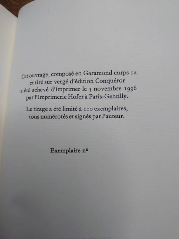 Nantes, Convergence, 1996. 16 x 10,8 cm, 134 pp. Broché, couverture rempliée, en très bel état. Exemplaire sur vergé, ici non numéroté et non signé par l'auteur. Bel envoi autographe signé de l'auteur.