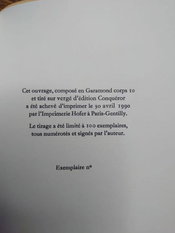 Nantes, Convergence, 1990. 16,2 x 10,5 cm, 75 pp. Broché, couverture rempliée, en très bel état. Édition originale, ex. de passe sur vergé non num. et non signé par l'auteur. Envoi autographe signé de l'auteur.