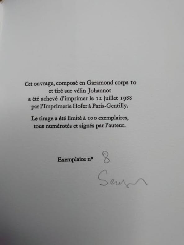 Nantes, Convergence, 1988. 19,5 x 11 cm, 78 pp. Broché, couverture rempliée, en très bel état. Édition originale, un des 100 ex. sur vélin num. et signé par l'auteur. Envoi autographe signé de l'auteur.
