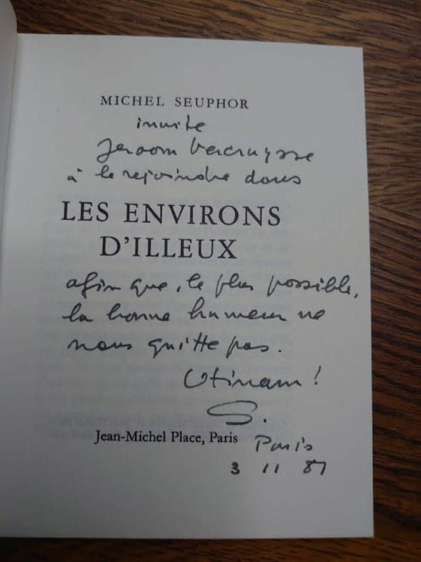 Milano All'Insegna del Pesc 1981 Petit in-12, broché, couverture imprimée.Edition originale, illustrée par l'auteur de 6 dessins à pleine page. Tirage unique limité à 500 exemplaires numérotés sur vélin. Précieux exemplaire offert par Michel Seuphor à l'artiste et relieuse Germaine de Coster, avec cet envoi autographe signé: Merci pour votre aimable signe de vie, chère Germaine. M'est-il permis de vous envoyer en retour ce petit divertissement? Avec mon meilleur souvenir et mon admiration. Seuphor. Paris, 3 juin 83. Une grande amitié liait Michel Seuphor et Germaine de Coster qui publièrent ensemble en 1957 le Zoologon pour lequel Germaine grava 16 bois.