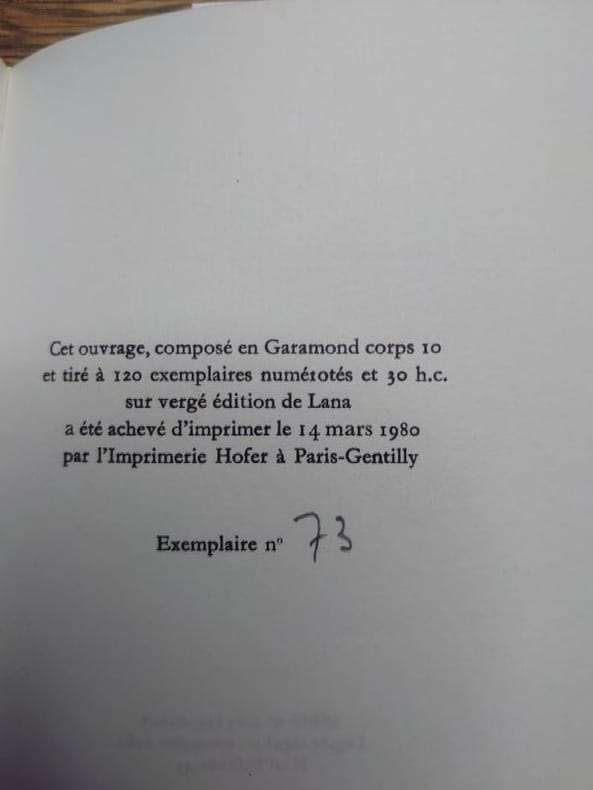 Tirage limite. Tirage de 120 exemplaires numerotes sur verge edition de Lana.