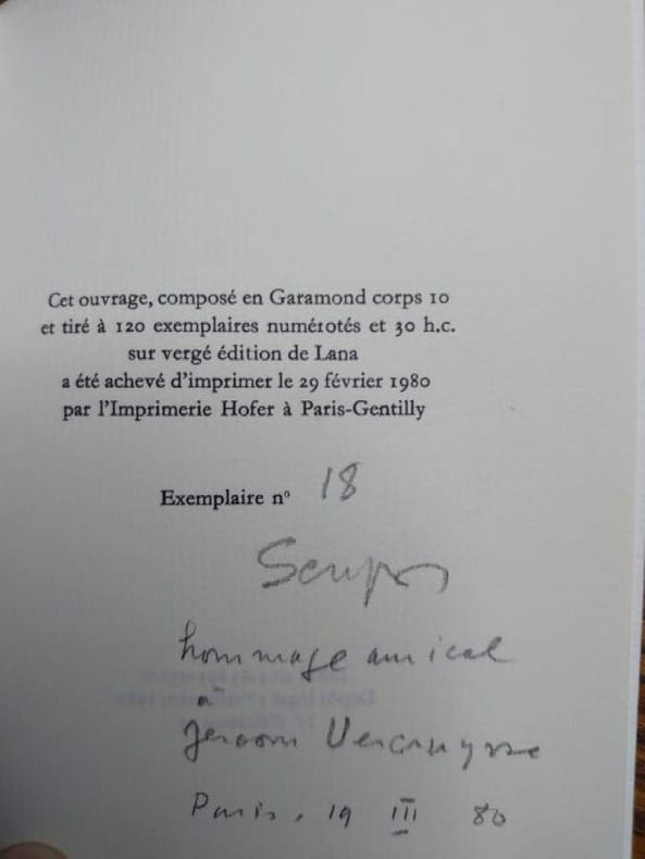 Jean-Michel Place, 1980. 14 x 10,5 cm, 73 pp. Broché couverture rempliée en bel état. Édition originale, un des 120 ex. num. sur vergé, signé par l'auteur. Envoi autographe signé de l'auteur.