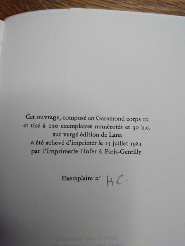 J.-M. Place, éd. 1981. In-12 broché. 92 pages. E.O. tirée à 120 exemplaires sur vergé de Lana (+ 30 H.-C.). 1/30 H.-C.
