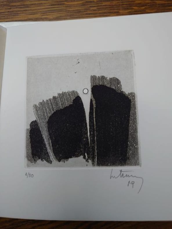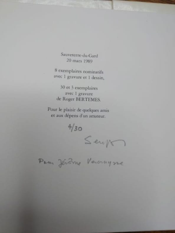 Sauveterre-du-Gard, La Balance, 1989. 15,8 x 15,5 cm, non paginé. En feuilles sous couverture rempliée. Bel exemplaire. Édition originale, un des 3 ex. num. avec une gravure originale signée et numérotée par Roger Berthemes. Signé et numéroté au colophon par Michel Seuphor avec un envoi.