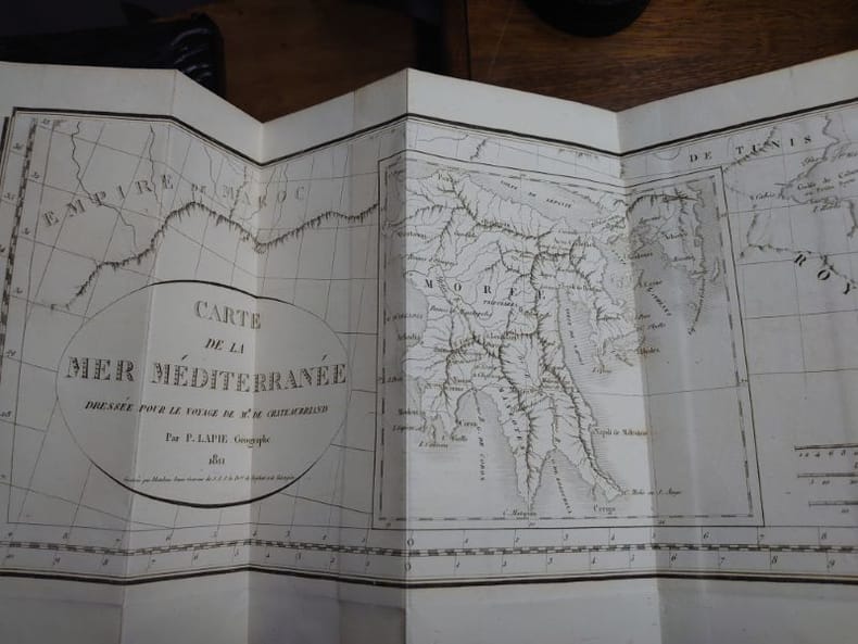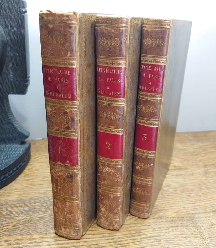 Paris, Le Normant, 1822. 22,3 x 13,8 cm, 1 f. bl., cxx - 270 pp. et 2 ff. bl. ; 1 f. bl., 2 ff. n.fol., 401 pp. et 1 f. bl. ; 1 f. bl., 2 ff. n.fol., 354 pp. et 1 f. bl. Trois volumes reliures plein veau d'époque, dos lisses, pièces de titre rouges, caissons ornées, tranches jaspées. Dos légèrement passés, infimes traces de frottements et coins très légèrement émoussés, sinon beaux exemplaires de cette quatrième édition. Le tome I contient la grande carte dépliante gravée de « La Mer Méditerranée » par Pierre Lapie (environ 51 × 79 cm), avec une déchirure. Ex-libris contrecollé du baron Janssen. Insérée lettre tapuscrite signée d'un libraire parisien, Henri Lefebvre, datée du 24 novembre 1954, adressée à madame Janssen lui annonçant qu'il a trouvé cet exmplaire de Chateaubriand.