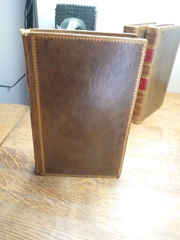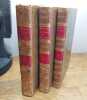 Paris, Le Normant, 1822. 3 vol. au format in-8 (223 x 138 mm) de 1 f. bl., cxx - 270 pp. et 2 ff. bl. ; 1 f. bl., 2 ff. n.fol., 401 pp. et 1 f. bl. ; 1 f. bl., 2 ff. n.fol., 354 pp. et 1 f. bl. Reliures uniformes de l'époque de pleine basane flammée havane, plats jansénistes, dos lisses et légèrement teinté vert-d'eau ornés d'un décor ''à la grotesque'' comportant roulettes dorés, filets sinusoïdaux dorés, jeu de petits filets obliques dorés, larges fleurons romantiques dorés, entrelacs de filets en pointillés dorés, semis de petits fleurons dorés, pièces de titre de maroquin vieux-rouge, pièces de tomaison de maroquin havane, titre doré, tomaison dorée au centre d'un ovale stylisé doré, palette dorée en tête et queue, filet doré sur les coupes, toutes tranches jaunes.
