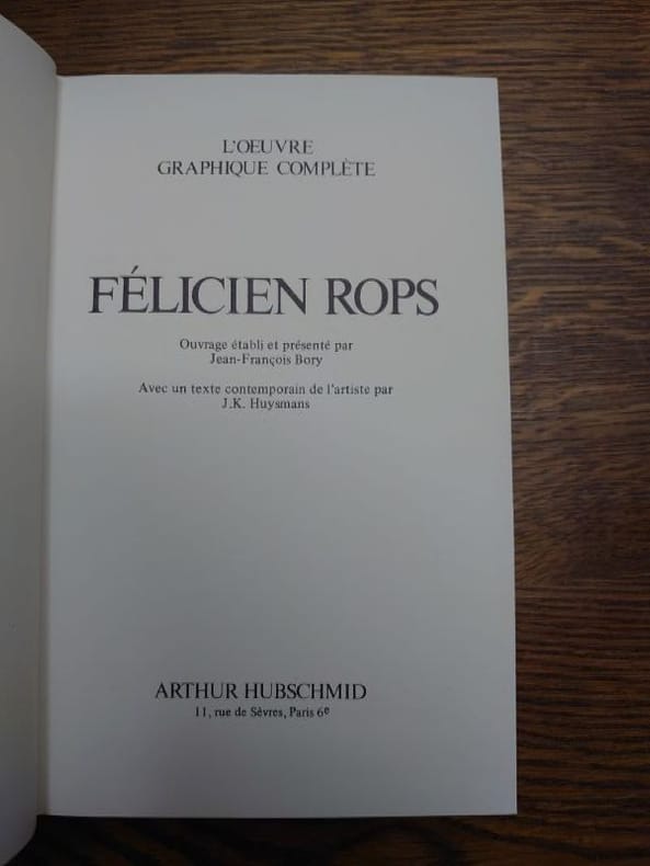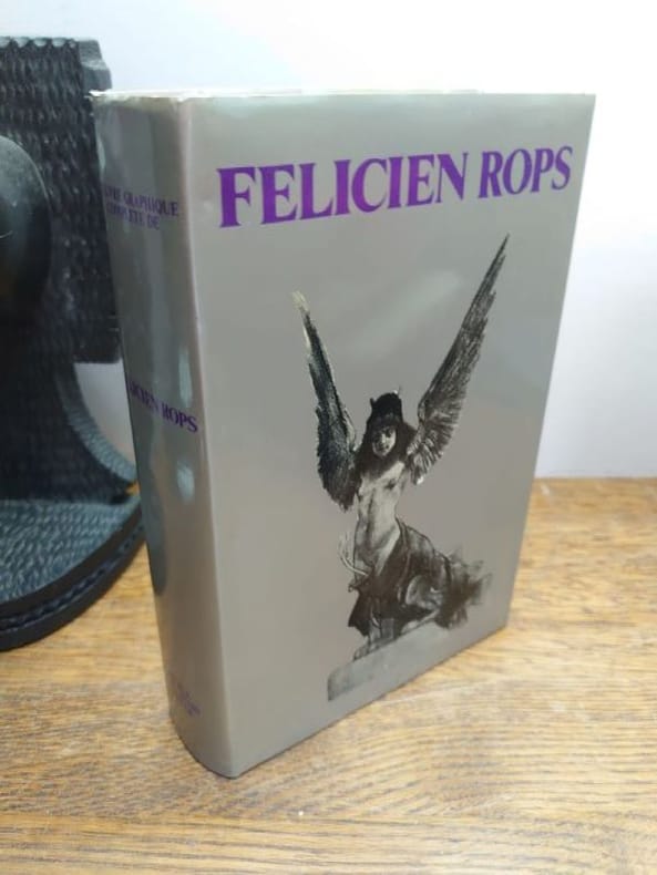 Paris, Hubschmid, 1977. Un volume relié in-8 (14 x 22 cm) de 688 pages. Cartonnage toile de l'éditeur, jaquette illustrée. Exemplaire en bon état. Plus de 640 planches, représentant la quasi totalité de l'oeuvre graphique de Félicien Rops, sont ici reproduites à pleine page. Les planches sont classées par 1° Frontispices et illustrations. 2° Lithographies. 3° Planches d'essais. 4° Études et compositions. 5° Planches libres. 6° Menus, lettrines, invitations, marques. 7° Suite libre.