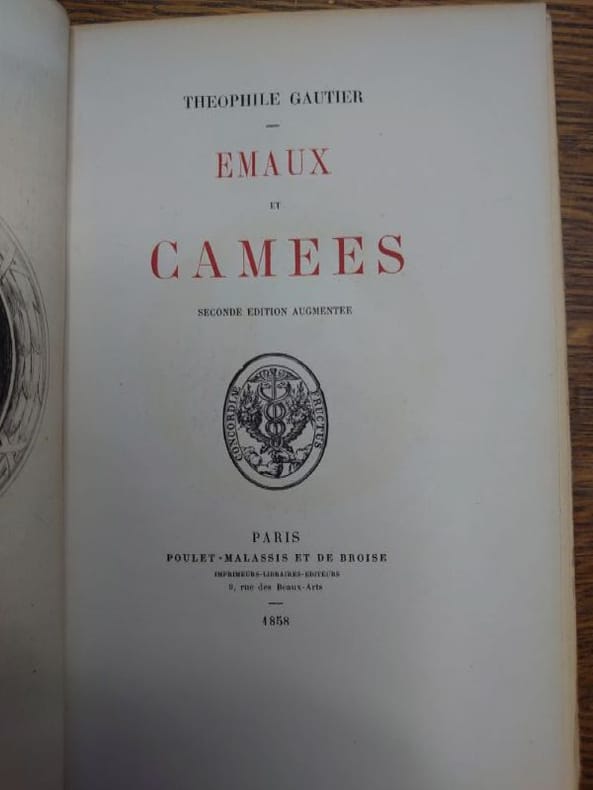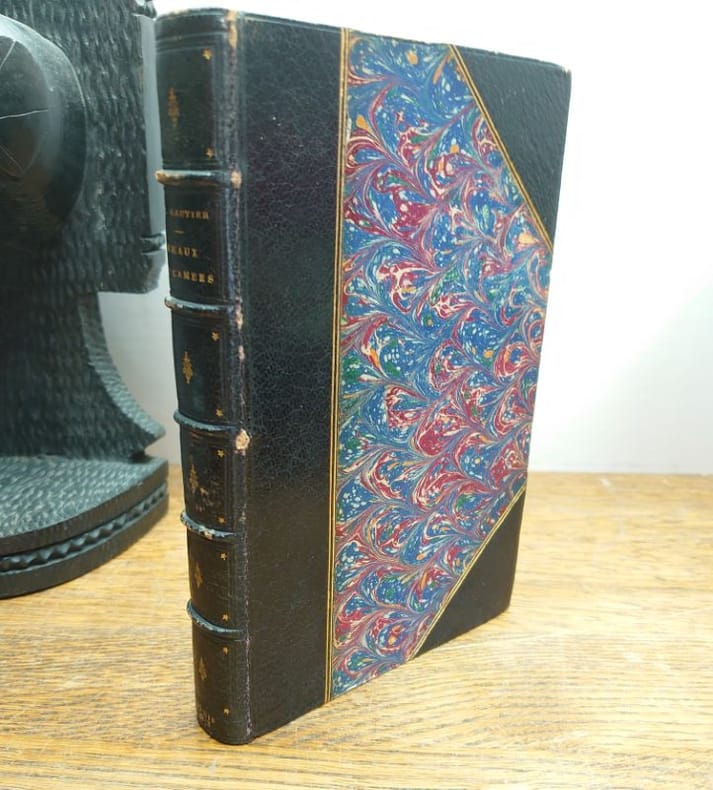 Poulet-Malassis et de Broise, Paris, 1858. 19 x 12 cm, (2) ff. - 230 pp. - (1) ff. Reliure demi maroquin à coins, dos à nerfs, caissons ornés, titre doré, couvertures conservées. Traces de frottement sinon bon exemplaire. En fait troisième édition, en partie originale, augmentée de 9 poèmes inédits. L'édition originale de 1852 chez Didier contenant 18 poèmes, celle de Poulet-Malassis en contient donc 27, dont la Préface (les 2 poèmes ajoutés à la seconde édition en 1853 chez Didier également, n'ont pas été repris, Les Accroche-coeurs et Les Néreides). Les 9 poèmes nouveaux sont : Odelette anacréontique, Fumée, Apollonie, L'Aveugle, Lied, Fantaisies d'hiver, La Source, L'Art, Buchers et tombeaux. Illustré d'un beau frontispice, ici en trois états (ocre, bistre, et noir et blanc), dessiné et gravé à l'eau-forte par Emile Théodore THEROND, représentant un portrait de l'auteur en médaillon, ainsi que de bandeaux et culs-de-lampe gravés sur bois, par le même. Et inséré un portrait gravé (plus tardif 1872?) de Théophile Gautier par Jules Jacquemart.