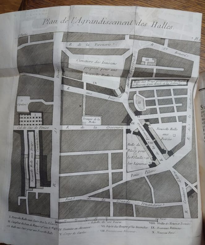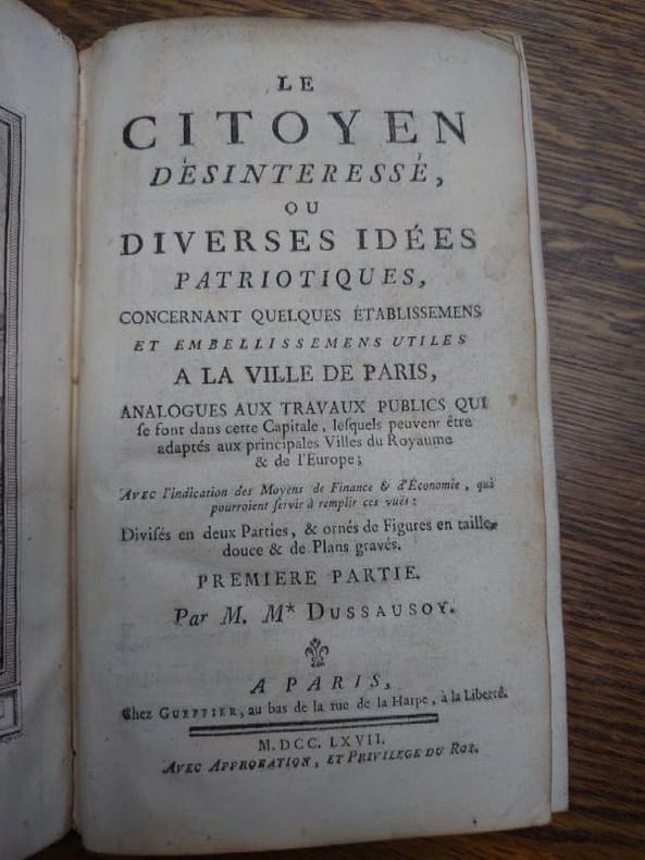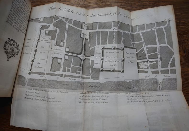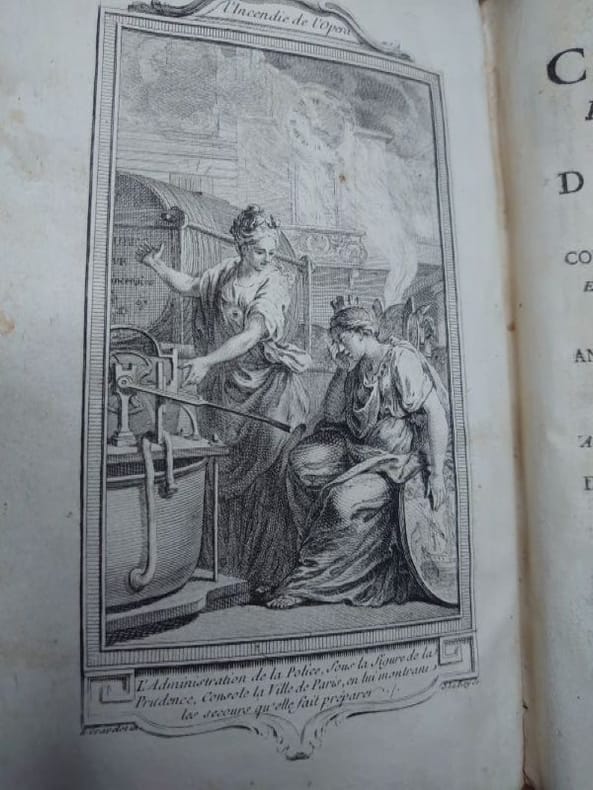 Paris, chez Gueffier, 1767 et chez Gueffier, Veuve Duchesne, Panckoucke 1768. 20 x 13 cm, 2 ff.-180 pp.-2 ff. et iv-198 pp.-1 ff. Deux parties en un volume, reliure plein veau d'époque, dos à nerfs, caissons ornés, pièce de titre. Reliure légèrement usée, coins émoussés, infimes traces de frottement et mors fendu sur 1 cm, des mouillures claires sinon bon exemplaire. Tome I : Un frontispice, LIncendie de lOpéra. LAdministration de la Police, sous la figure de la Prudence, console la Ville de Paris, en lui montrant les secours quelle fait préparer. Trois planches dépliantes : Etat de la distribution des seize dépôts de Pompes publiques que lon propose détablir dans la Ville & Faubours de Paris, suivant la division de son Plan en trois parties - Ensemble de la position de quatre Entrepôts en dépendance - Plan d'Agrandissement des Halles & Marchés, lAchèvement des Tuileries. Une planche simple : Colonade du Louvre. Soit 5 gravures. Tome II : Un frontispice, Le roy Stanislas est couronné par lAmour de la Patrie. La Lorraine sous la Figure de la Reconnaissance, dépose sur lAutel de lImmortalité, le Recueil des Fondations & plans des Edifices dont S.M.Pol a embeli cette Province. Le génie des arts grave sur le devant de cet Autel, le nom de Stanislas le Bienfaisant. Une planche dépliante : Plan, pour la reconstruction de la Salle de la Comédie françoise, sur son propre terrain, avec de nouveaux percés, et principalement louverture de celui de la Rüe de Tournon à la Rüe de Seine. Soit 2 gravures. Complet de toutes les gravures.